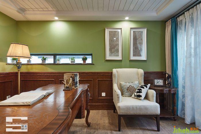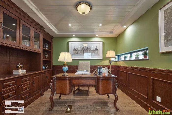 三樓書房:書房同樣以沉穩(wěn)的棕木色為主,選擇美式古典桌椅與書柜配上別致燈飾,懷舊的擺件很有民國的味道,綠色的墻面與外界綠植相呼應(yīng),瑩潤了書房的質(zhì)感與舒適度,對閱讀辦公的品質(zhì)有著很高的追求。