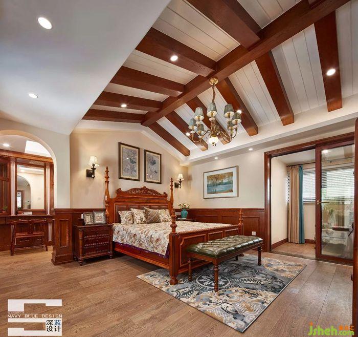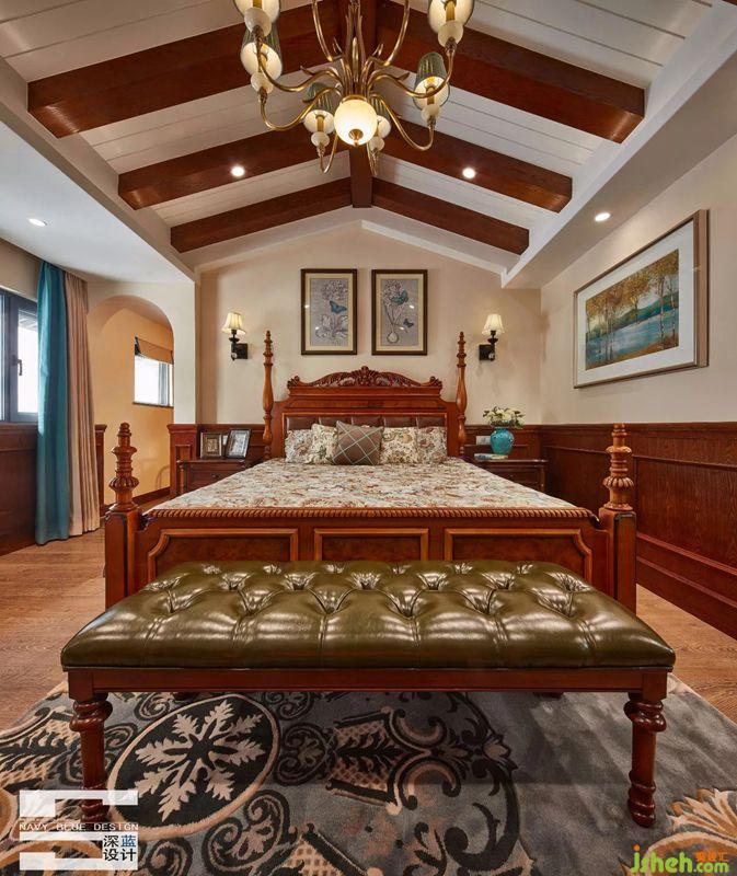 三樓主臥:主臥利用原建筑的斜頂做成木梁式吊頂,一種莊重大氣感油然而生,彰顯業(yè)主尊貴的身份和高雅的品味。高背四柱床是空間的焦點(diǎn),從墻面掛畫、印花床品、皮質(zhì)床邊凳至壁爐,元素不斷遞進(jìn)、深化,融于整個(gè)臥室氛圍,原木肌理伴你輕松入眠。