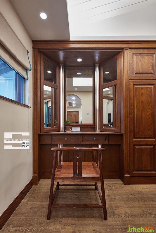 精心定制的實(shí)木梳妝臺(tái)與衣柜一體,鏡子后面體現(xiàn)出設(shè)計(jì)的巧妙之處,兩邊分別拉開可歸置首飾化妝品等物件。