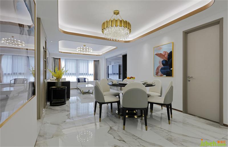 本案舊房改造設(shè)計以白色為基調(diào),天花搭配金屬線條,整體干凈利落,為空間勾畫出簡潔大氣的韻味,打造現(xiàn)代輕奢感。沙發(fā)背景用的是淺灰色硬包,金屬裝飾讓空間相互呼應(yīng),局部木飾面裝飾讓空間看起來不再單調(diào)。