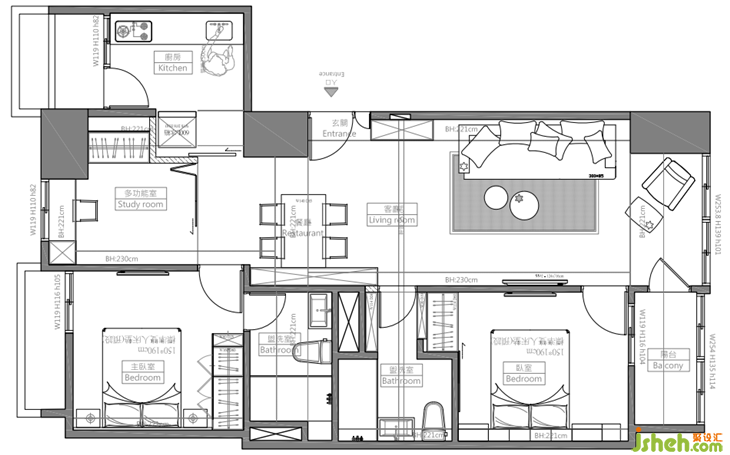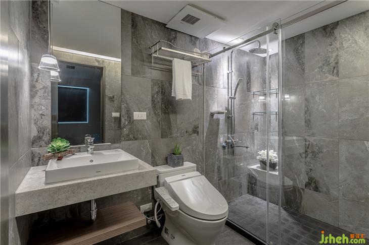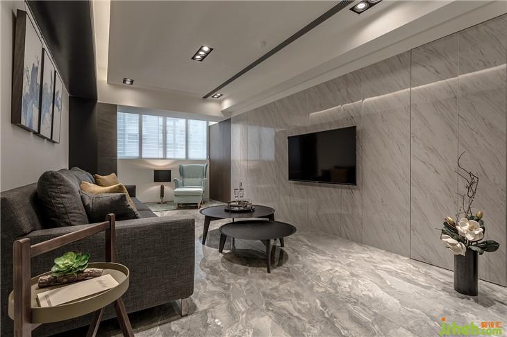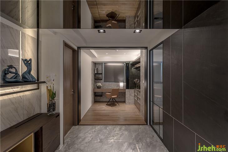 電視墻面與臥室門、公領(lǐng)域衛(wèi)生間門做結(jié)合放大了大理石電視墻的尺度,也解決了衛(wèi)生間門面對大門的窘境。室內(nèi)設(shè)計(jì)師