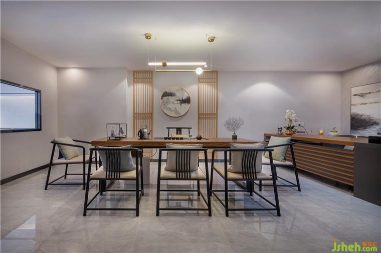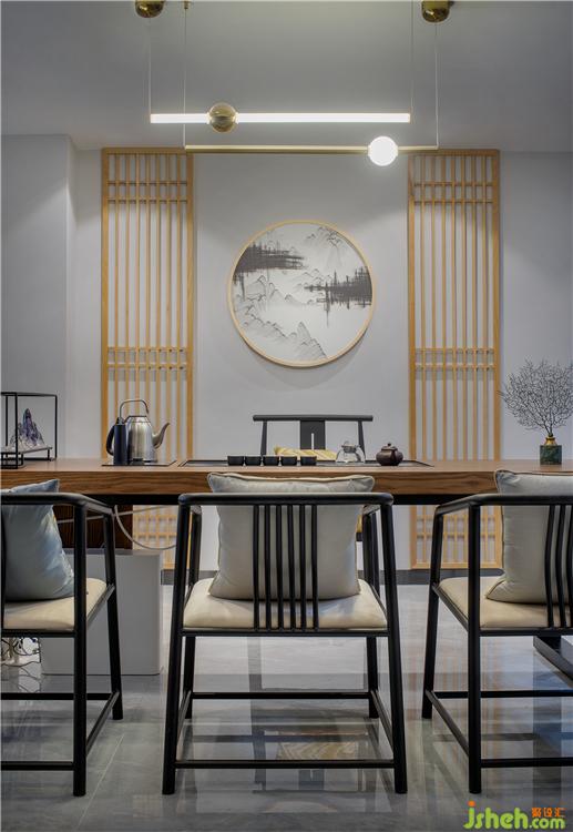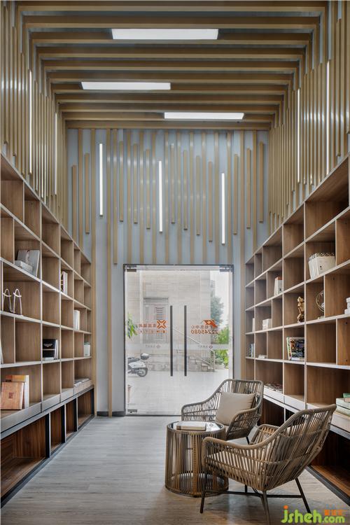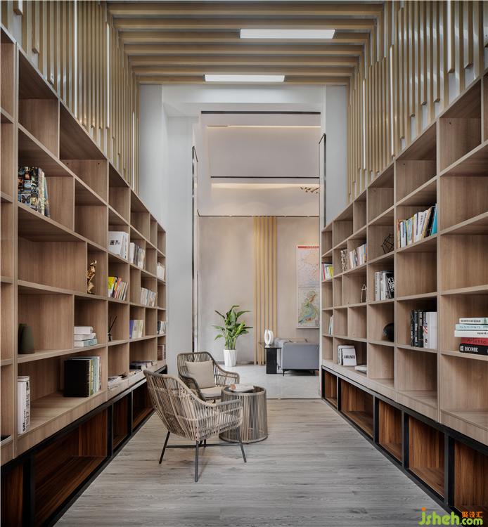 書吧區(qū)域設(shè)計(jì)師希望在此營造“私享書房”的自在、愜意氛圍。讓客人暫時(shí)卸下生活的疲憊,探尋生活與事業(yè)的新靈感。木色與莫蘭迪灰色系墻面形成整體色調(diào)呈現(xiàn),原木條、皮革、金屬材質(zhì)共同運(yùn)用為空間自然原始的氛圍營造貢獻(xiàn),增加空間趣味性同時(shí),也增加了訪客停步率,成為一種具有功能性的藝術(shù)裝飾。在日光或燈光的映照下,室內(nèi)大小空間有了表情,明與暗的層次、虛與實(shí)的對比、形與影的競走,豐富著空間的意境氛圍。