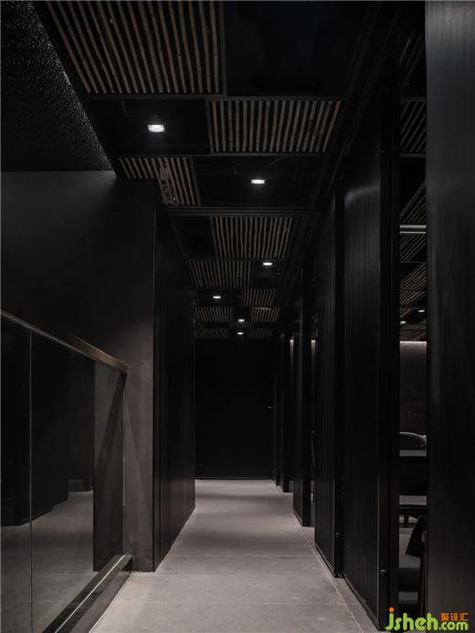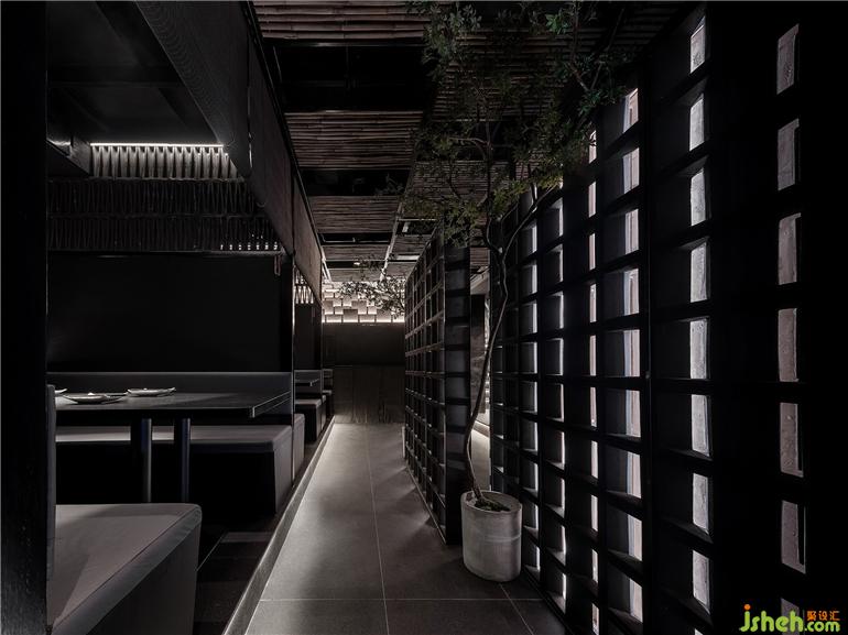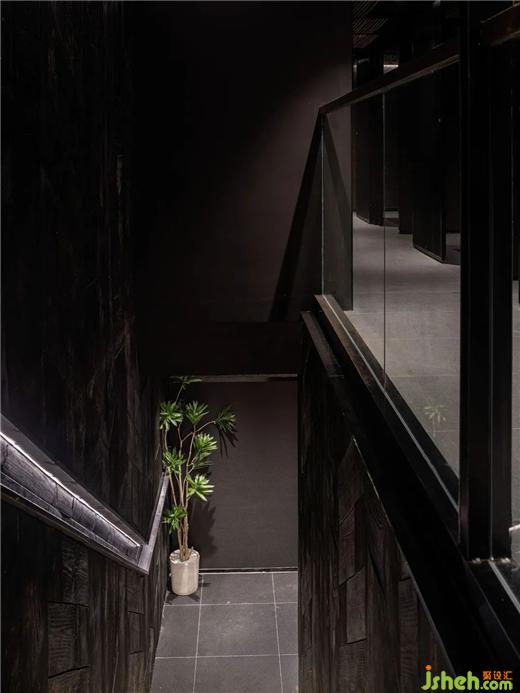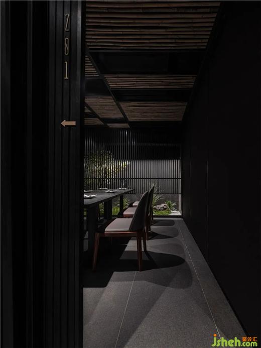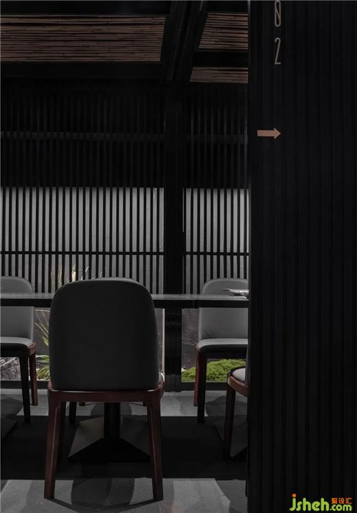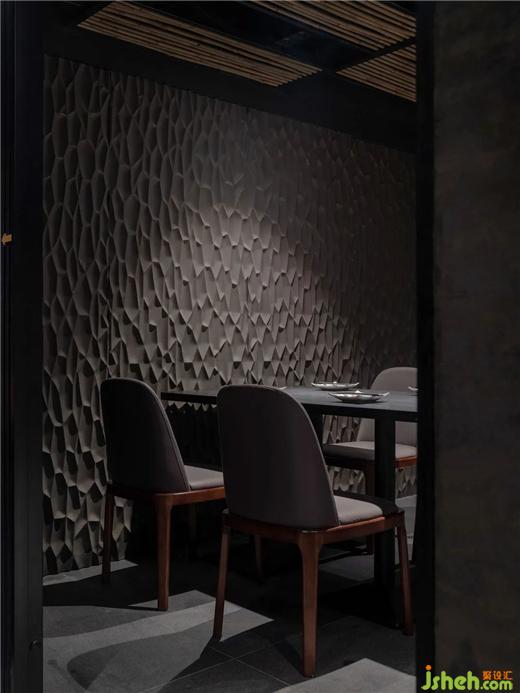 樓梯間墻面選用原始碳化木,經(jīng)過(guò)不規(guī)則的幾何圖形排列,增強(qiáng)了空間的趣味性。踏階與樓梯扶手處的燈帶,作為視覺(jué)方向的指引。日料餐廳設(shè)計(jì)細(xì)竹材質(zhì)錯(cuò)落有秩地嵌入天花,深灰色夯土與碳化木材質(zhì)的墻面,讓人置身于沉靜純粹的氛圍之中。
