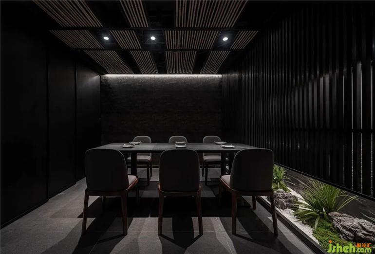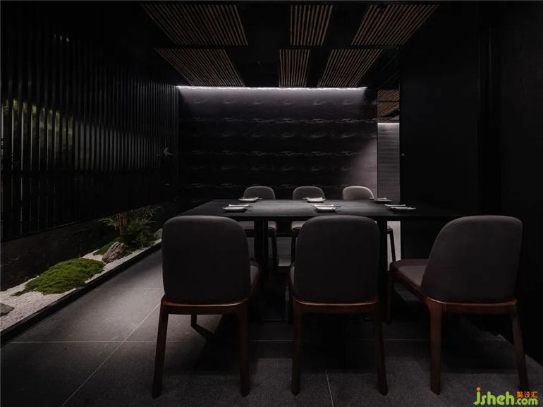 餐廳一側(cè)引入日式枯山水造景,成為設(shè)計(jì)的點(diǎn)睛之筆,營(yíng)造出一花一世界,一木一浮生的境界,日料餐廳設(shè)計(jì)仿佛在觀賞一個(gè)微型的大自然。白砂、石、青苔、綠植,看似簡(jiǎn)約的擺置下,每一個(gè)自然之物都深有禪意。樸拙的東方調(diào)性,呼應(yīng)現(xiàn)代的自由精神,侘寂之美融入此情此景中。