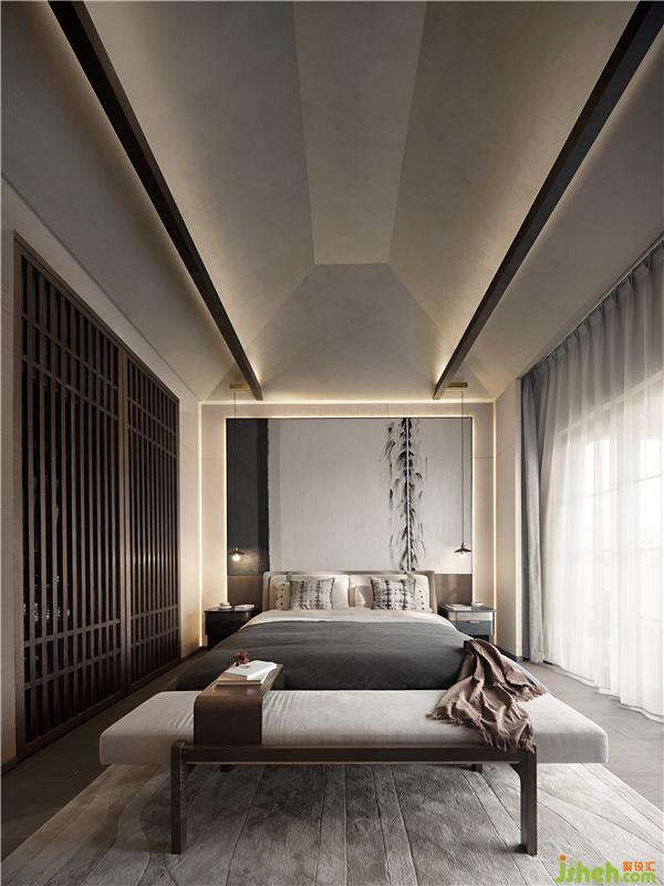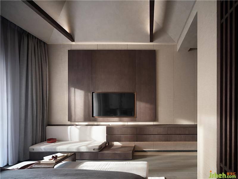 Surround the lamp belt with beams and columns to form indirect lighting,Foil the warm atmosphere that the bedroom should have. Innight, talk with each other for a long time; let the warmth bloom in this space. The cloakroom is divided by the sliding door design, and the simple texture of brown mahogany reflects the noble life trend.
