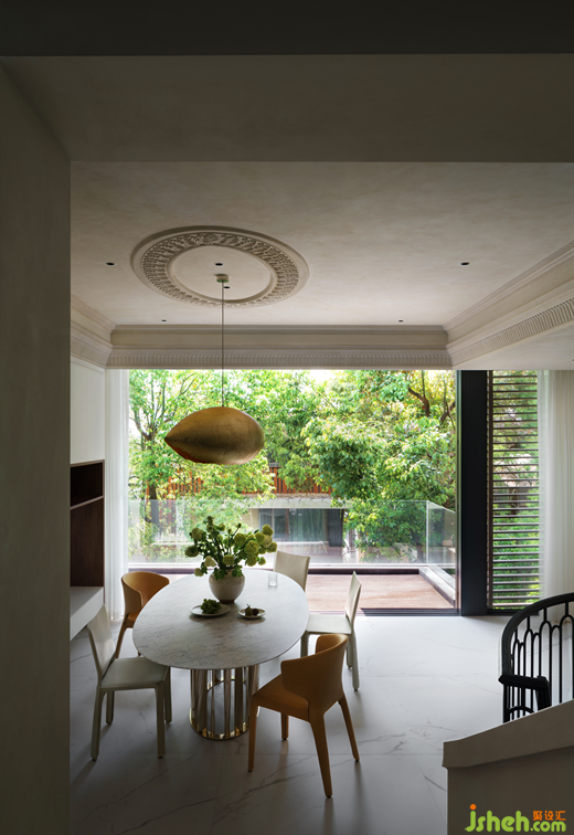 成都別墅設(shè)計以橢圓元素為主的主餐區(qū)既圍坐親和,又不像正圓餐桌那樣的正式。樓梯處的綠色墻體有著大自然皮膚一樣的肌理,與橢圓鏡子里映射出的自然、戶外真實(shí)的綠意形成呼應(yīng)。