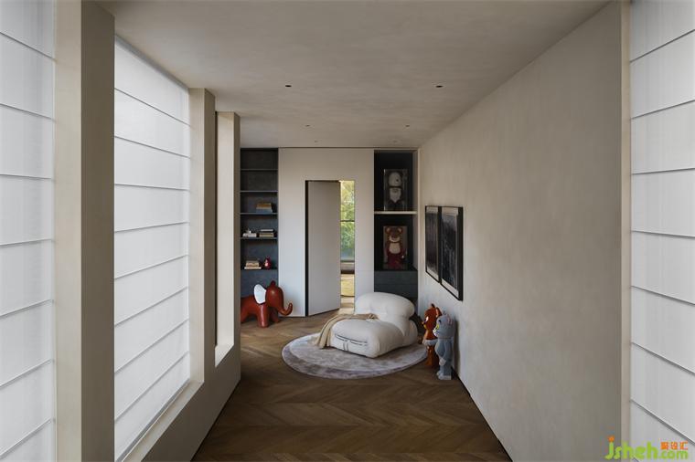 三層生活空間有著比一、二層更多的攝影和藝術(shù)品,其中,攝影都是男主人的生活習(xí)作與記錄,凝固著自己和家人體驗過的畫面。設(shè)計師將此作為裝飾家的藝術(shù):將其散落布置在家的各個角落,畫框里放進(jìn)了往日存在,休息的時候就像休息在自己的往昔時光里,這樣就能輕易的獲得舊夢重溫的美妙。
