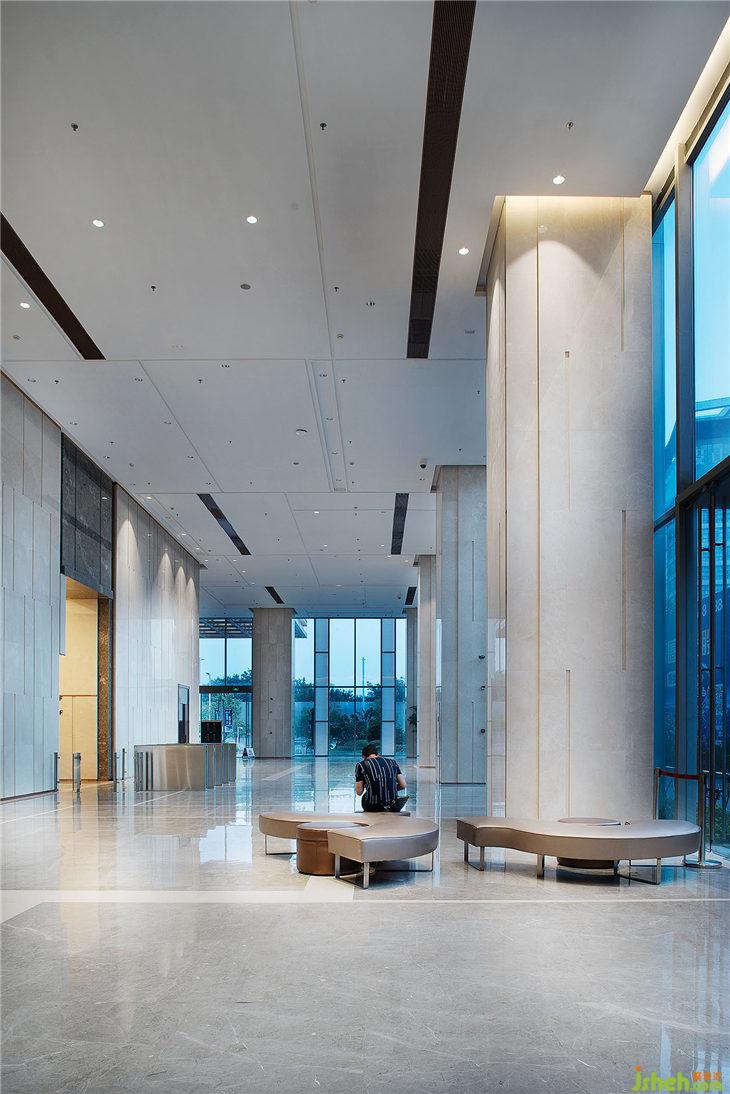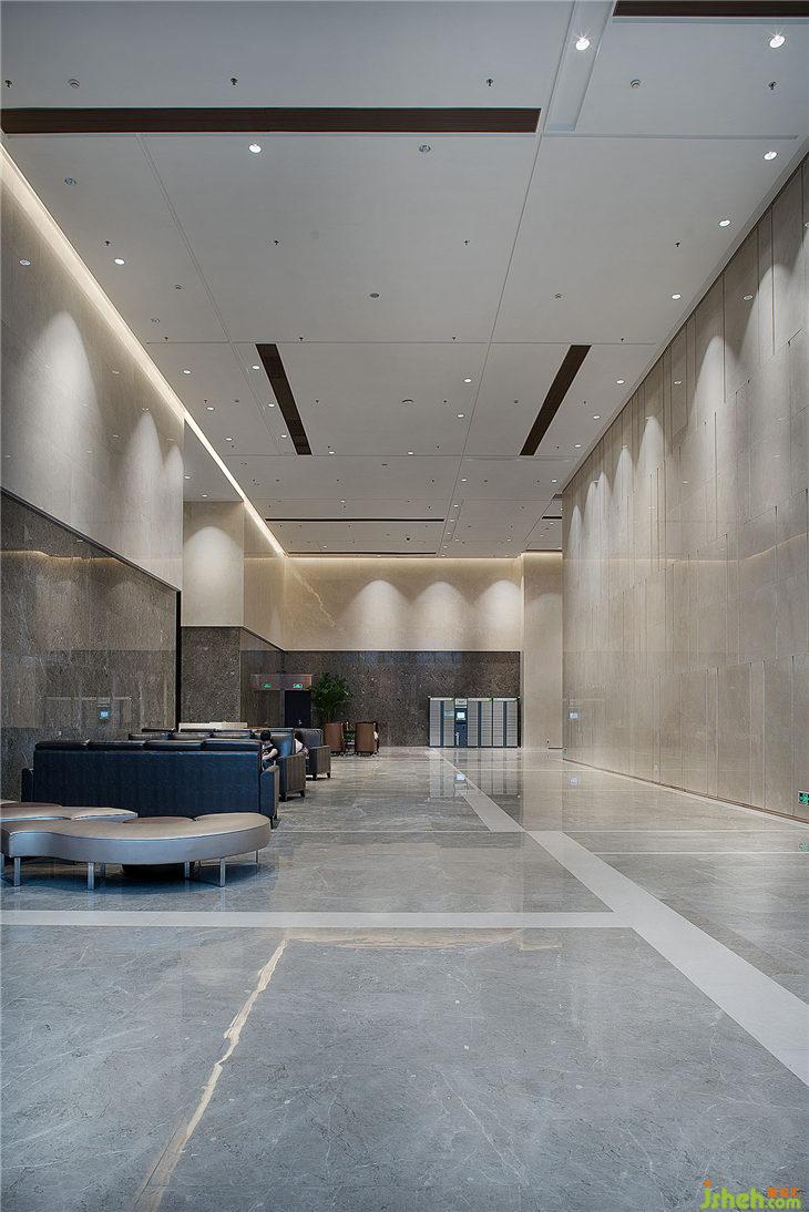 大廳比較注重大氣、開敞、嚴(yán)謹(jǐn)、莊重,所以我們運(yùn)用灰色大理石,深色木飾面以及白色軟膜、白色油漆。在形式上講究一個(gè)“一”字表現(xiàn),行業(yè)第一、中國(guó)第一、亞洲一?;ㄖ幸浴耙弧痹赜密浤ぜ盁艄庾隽艘粋€(gè)大大的“一”字。其二,大辦公室天花保留原頂, 享受更高的空間,保持內(nèi)部更多的空氣,綜合區(qū)辦公可容納50—60人同時(shí)辦公,開闊又明亮,同事間的互動(dòng)增強(qiáng),也提升了辦公效率,又不失嚴(yán)謹(jǐn)。過(guò)道是大辦公室的重頭戲,體現(xiàn)了出大企業(yè)的氣場(chǎng)。大會(huì)議室的天花與建筑外觀的小塊豎條造型形成呼應(yīng),用簡(jiǎn)單的線條勾畫出九個(gè)區(qū)域、形成“九五之尊”之意。