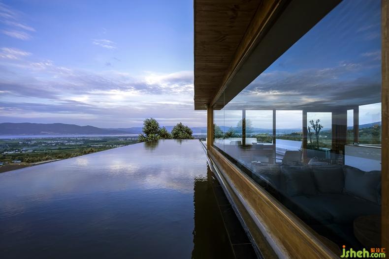 As the second public space, the semi-opened space on the top pushed the building to another climax, where the designers designed the coffee bar, communication area and sightseeing as a whole. The elaborate windows "cut" and "borrow" the sceneries of sunrise and sunset in Cangshan and Erhai lake. People enjoy their own leisure quietly, the book bar and terrace are close to the pool, that is a true 360 ° viewing platform. The huge pool becomes a delicate continuation of the Erhai Lake and floating clouds like a mirror, it leads people's vision away, melting in the uncertain daylight.