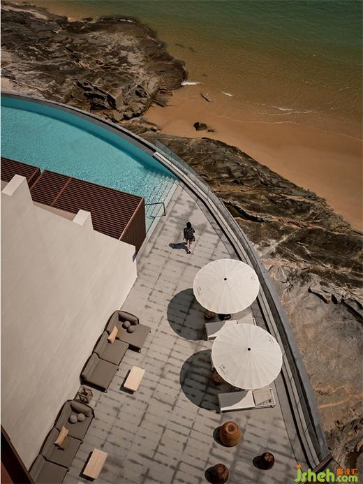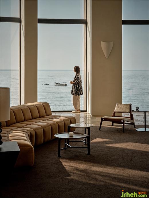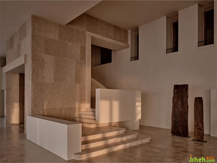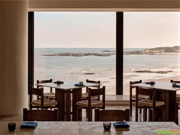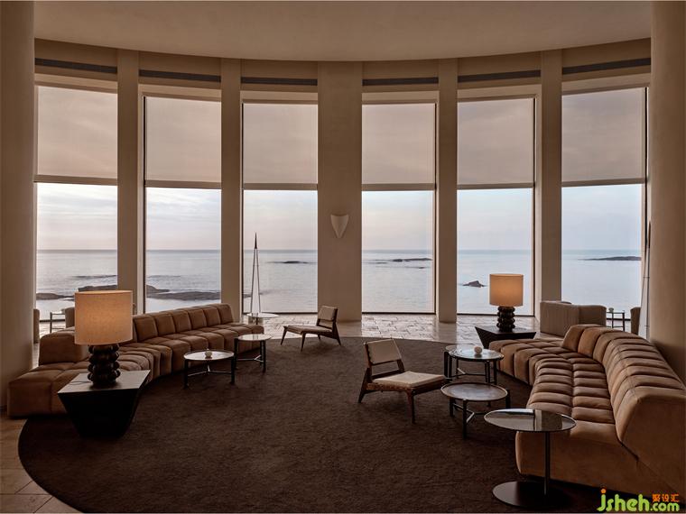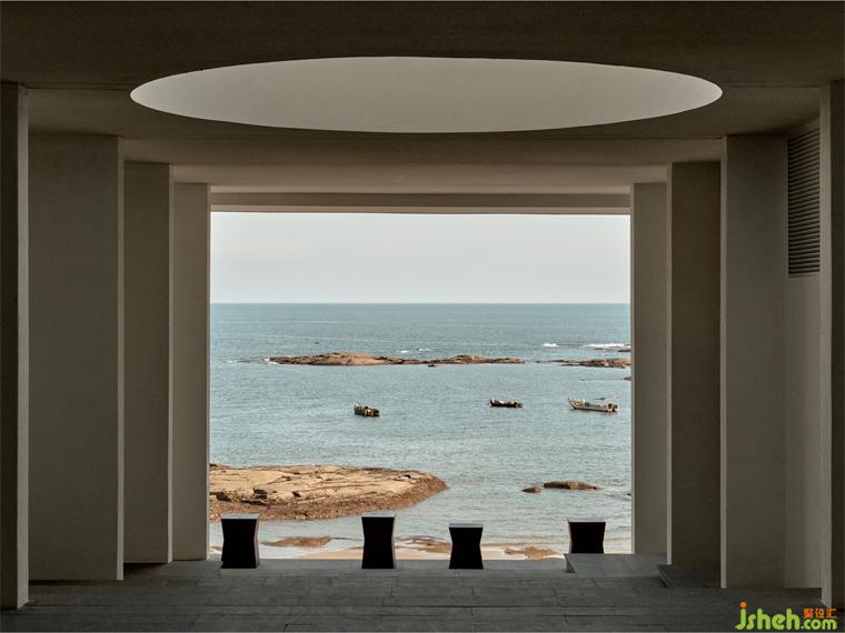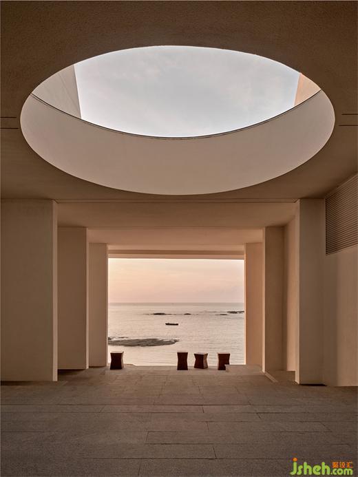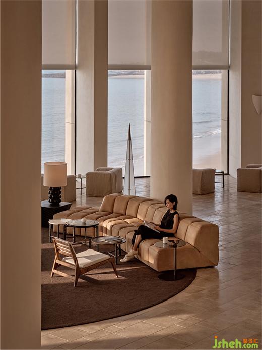 我們從入戶開始重新建立空間秩序,酒店設(shè)計(jì)將臺(tái)階打磨成與礁石共生融合的形態(tài),留出自然框景的“海天一色”作為前奏。并于整個(gè)空間的色彩、光影中呈現(xiàn)自然的節(jié)奏感,不同于室外的海天遼闊,進(jìn)入大堂,干凈利落的游廊以柱石的序列、米灰的色調(diào)和靜謐的燭光來(lái)屏蔽嘈雜的干擾,配合大量的留白空間。