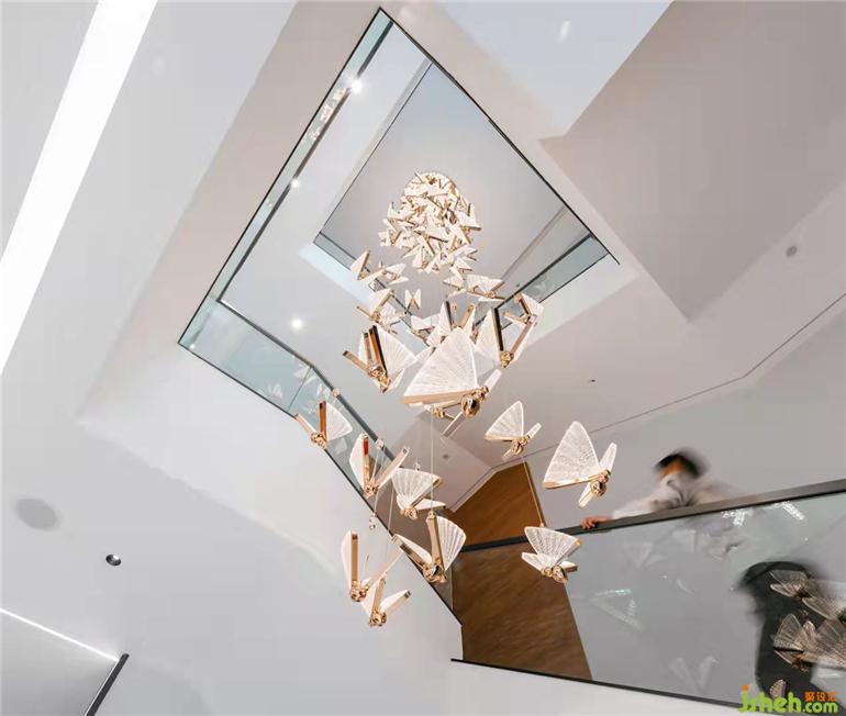 樓梯間由蝴蝶藝術(shù)燈飾構(gòu)建了一幅蝴蝶飛舞的情景,廣州別墅設(shè)計(jì)讓人感覺溫暖、而富有生活情趣,兩只蝴蝶的飛行軌跡交織成一個(gè)圓,寓意圓滿,是對(duì)美好的向往與追求。