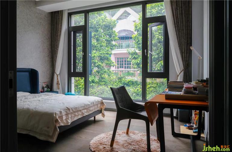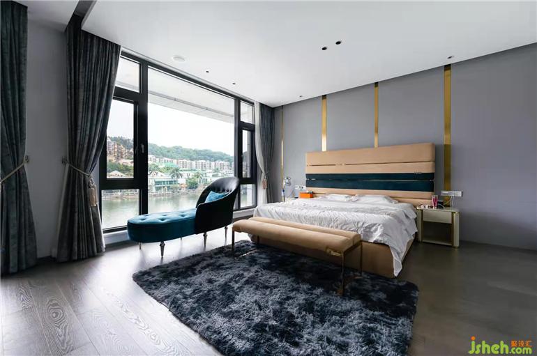 主臥采用厚重的色彩,多種不同的材質(zhì),融合于同一個(gè)空間內(nèi),散發(fā)厚重大氣之韻,加上整體色調(diào)的俊雅沉靜,廣州別墅設(shè)計(jì)共同營(yíng)造出舒適優(yōu)雅的休憩空間。此時(shí)自動(dòng)窗簾緩慢移動(dòng)到兩側(cè)即可將湖邊美景盡收眼底,帶來(lái)心曠神怡視覺享受。