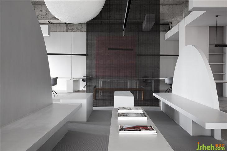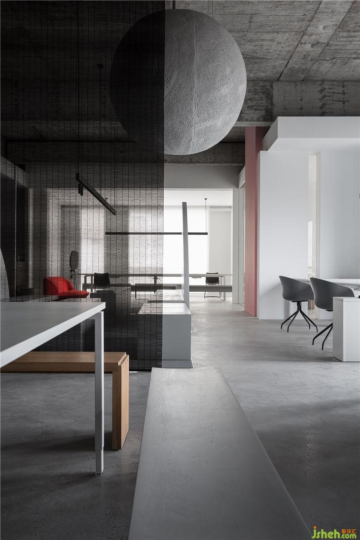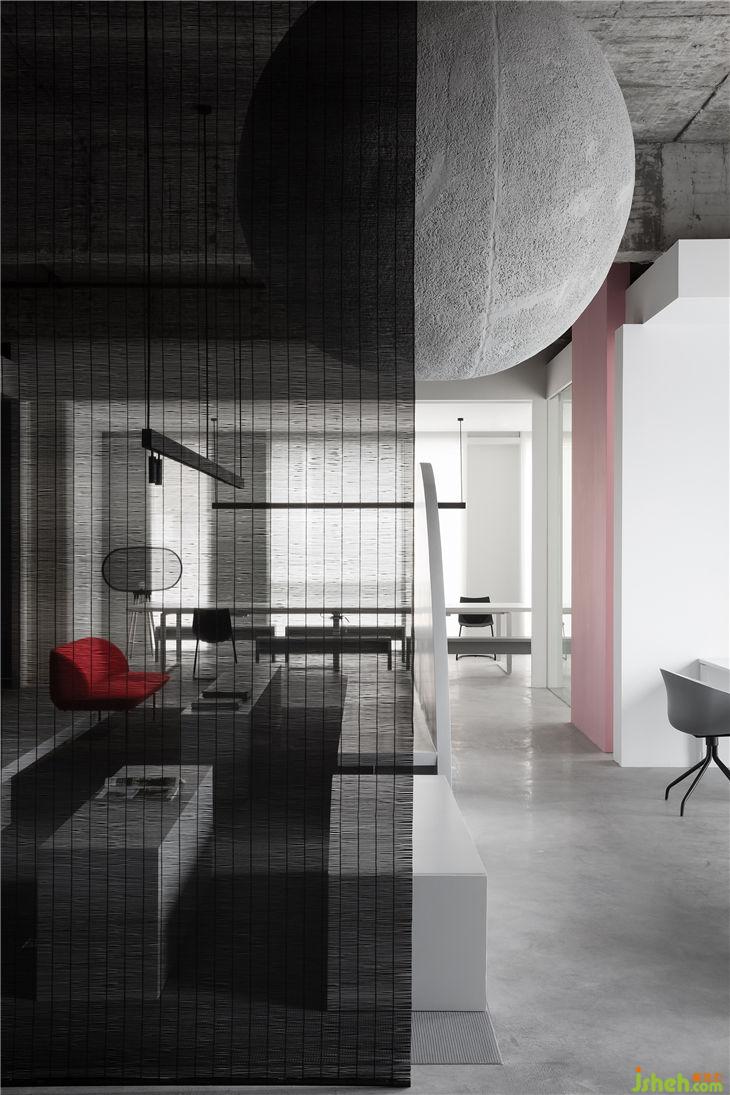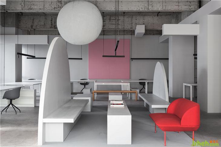 在空間整體冷靜色彩的提煉中,具有無限張力的留白處理,是設(shè)計師的克制處理。跳脫的紅與粉,就像是這未知空間中躁動的原點。白本身處于色界的極端,在這界線分明的空間中,會議區(qū)成了克制的純與空,紅色沙發(fā)與粉色板塊的激進(jìn)表達(dá),完全拋開了界的比例,對比鮮明。從色界極端入手,除了大膽的嘗試,克制與躁動的較量,還交織著與情緒相輔的空間感受,引發(fā)人的行為特征,促進(jìn)情感交流、思想碰撞。
