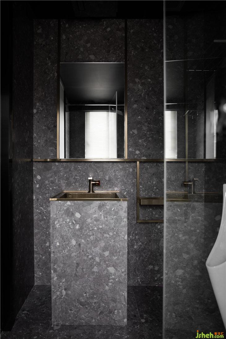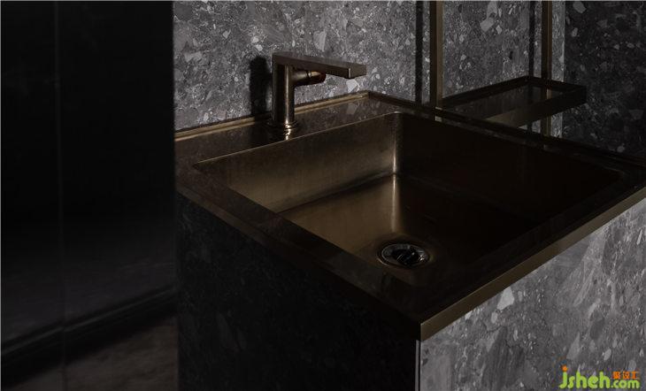 浴室以灰色水磨為底,金色不銹鋼為構(gòu)成要素,定制的手工不銹鋼盆,強調(diào)設計者對設計細節(jié)執(zhí)行的追求。