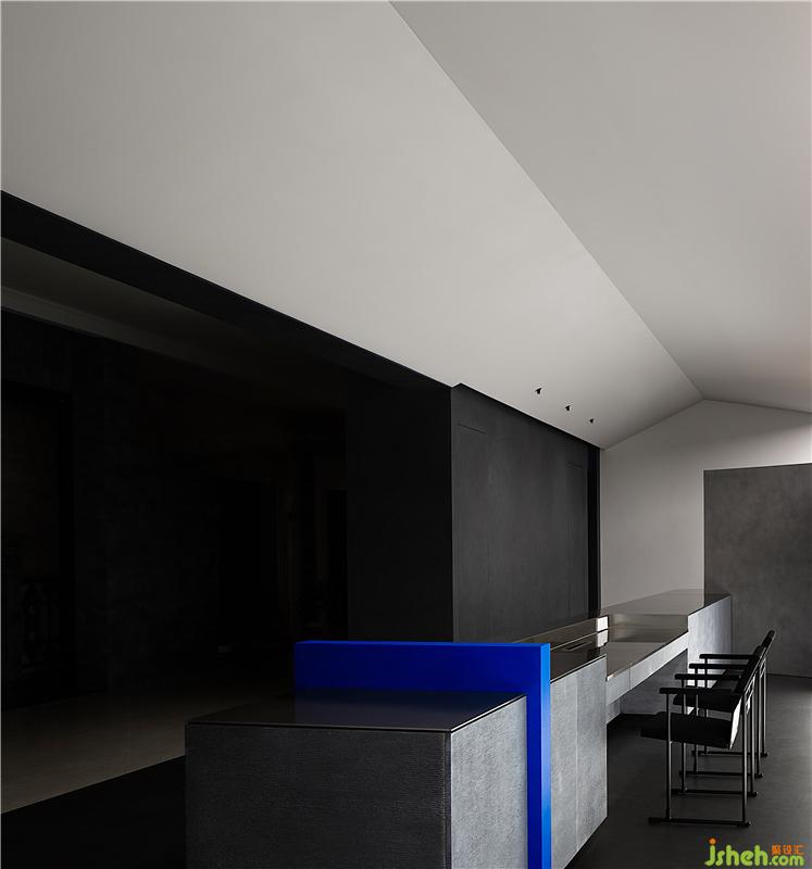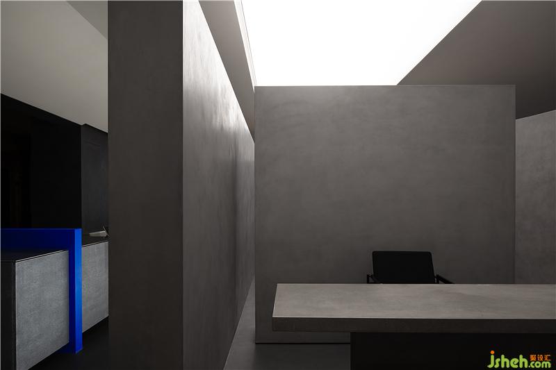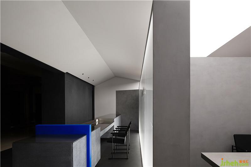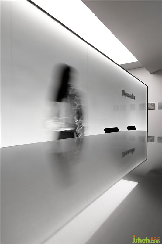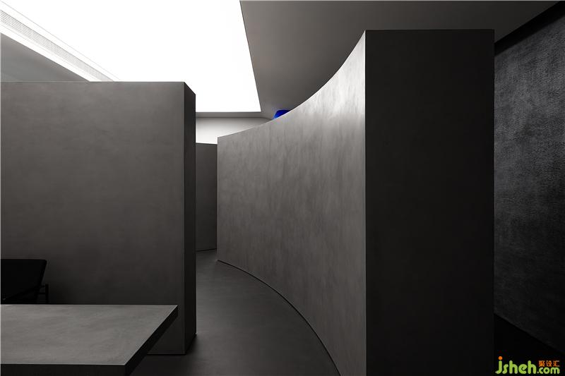 一次不一樣的思考,通常是比例,形體,材料,光線,細(xì)節(jié)來(lái)支撐空間,而這次是空間反過(guò)來(lái)支撐材料,材料才是這個(gè)空間的主體,需要表現(xiàn)與被表現(xiàn)的??臻g為材料退讓,把空間留給人,為人提供大量的交流和互動(dòng)的機(jī)會(huì)。自然的白色、灰色水泥質(zhì)感與銀色金屬漆墻面與入口的黑色洞石質(zhì)感墻體,幾種不同感受的質(zhì)感有機(jī)的融合在空間里。