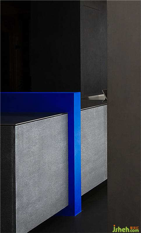 展示柜體成為分割空間唯一物質(zhì),與頂部分離,這種裝修設(shè)計(jì)空間的延續(xù)處理,藍(lán)色的小巨蛋存在角落的最高點(diǎn),與人活動(dòng)的過(guò)程都可以若隱若現(xiàn)的對(duì)話,更好的強(qiáng)調(diào)空間神秘與趣味的精神。地板堆疊的長(zhǎng)方體磚塊,是黑色金屬漆在粗糙質(zhì)感下的一次嘗試,意圖表現(xiàn)漆的多樣性與可以表達(dá)各種情緒。讓人可以感受空間與材料在呼吸。