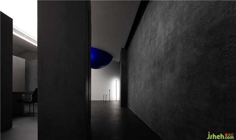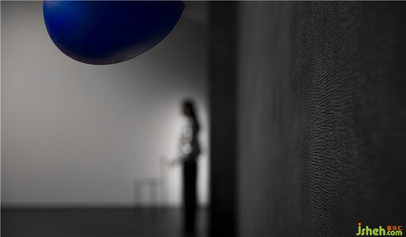 空間通過球體劃分了一個(gè)彈性的空間,這個(gè)場(chǎng)域人是空間的主體,沒有被圍合卻擁有最強(qiáng)場(chǎng)所感的區(qū)域,一個(gè)人與空間能交流的場(chǎng)所,自由的空間。裝修設(shè)計(jì)采用藍(lán)色,并與前臺(tái)的藍(lán)色相互平衡,讓兩者有一種孤獨(dú)的對(duì)話的情緒。用嚴(yán)謹(jǐn)?shù)膸缀沃刃騺順?gòu)建感性的場(chǎng)域,矛盾與協(xié)調(diào)的構(gòu)筑。