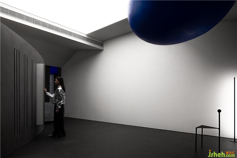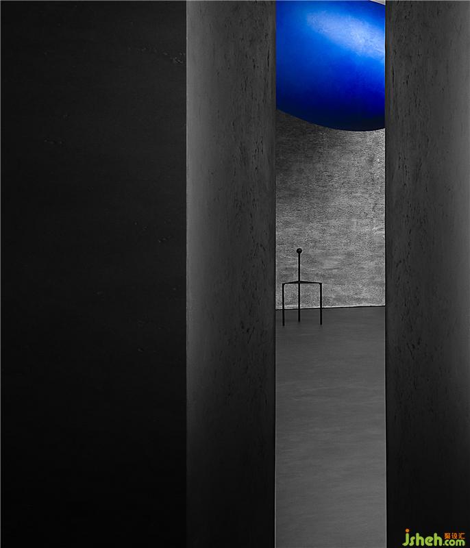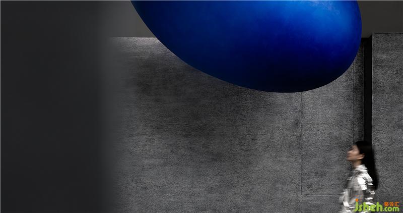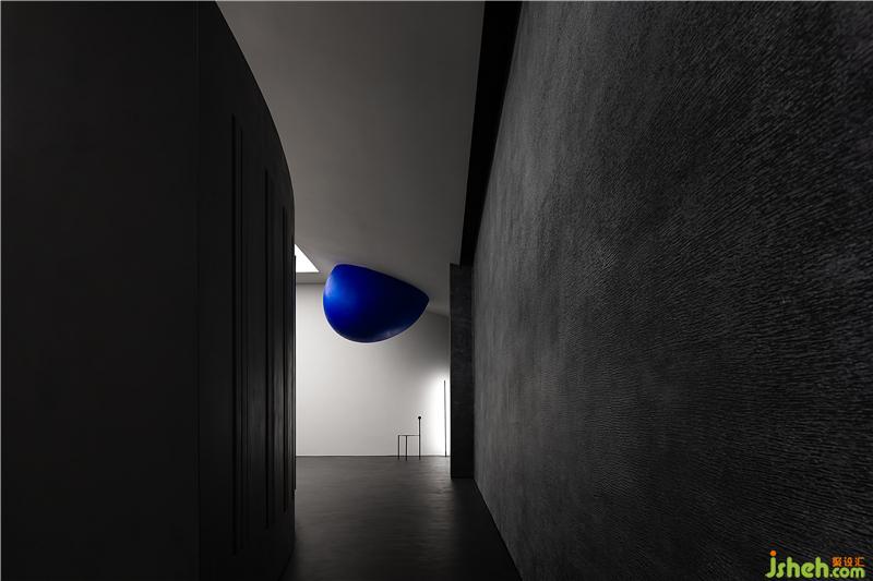 有計(jì)劃的將空間轉(zhuǎn)折的入口尺度縮小,提示你進(jìn)入不同情緒與味道的世界,小的口會(huì)讓你對(duì)后面的事情產(chǎn)生興趣與想象力,藍(lán)色的小巨蛋形幾何體從天而降,與平面的曲線相呼應(yīng),且產(chǎn)生強(qiáng)烈的力量感。