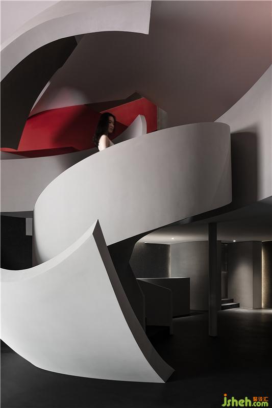 進入空間,曲線與直線的組合架構大型的幾何體量,厲冷的混凝土協(xié)作塑造強烈的沖擊感。視覺上線條的延伸交織,內含人體細胞流動的本質,當進入者緩緩而行,靜與動的相對情境才開始發(fā)揮作用。