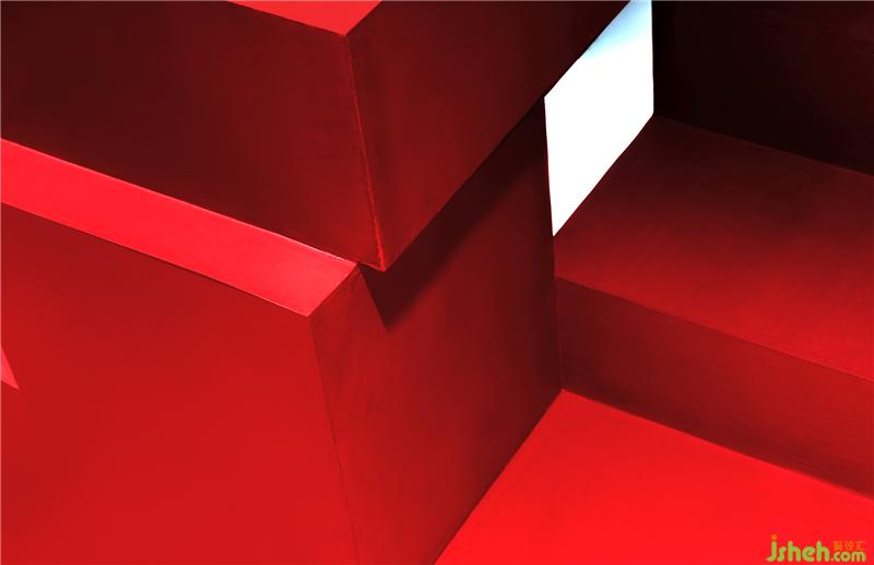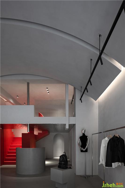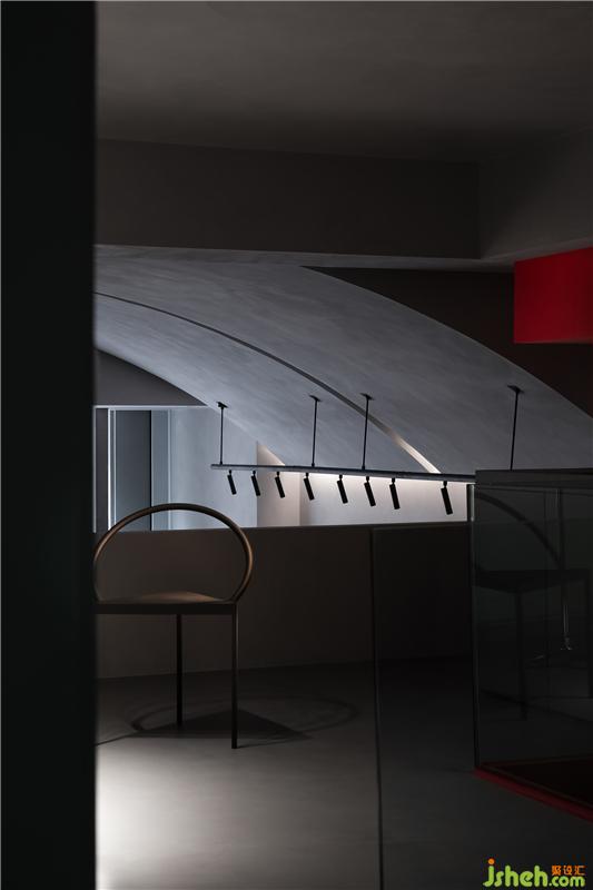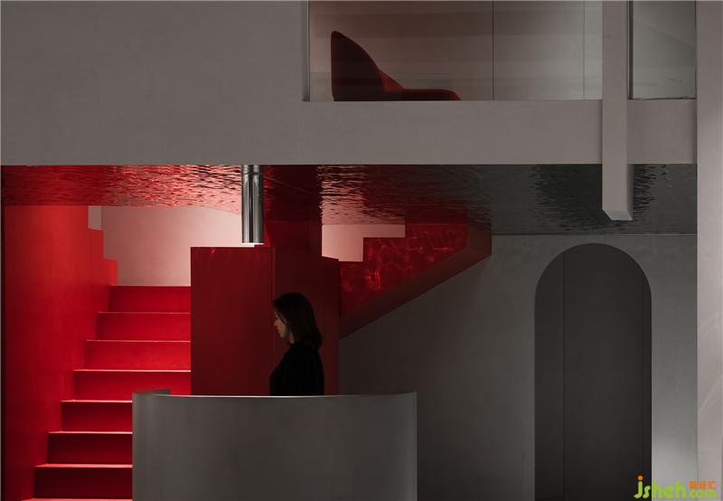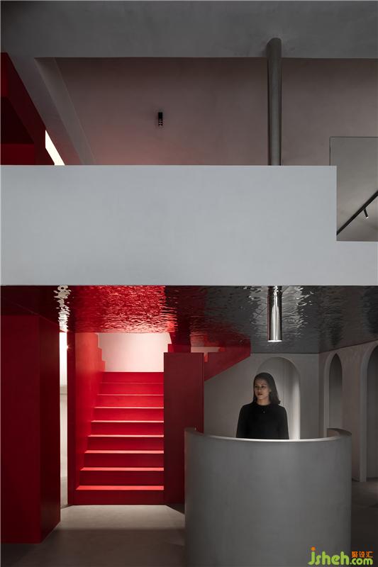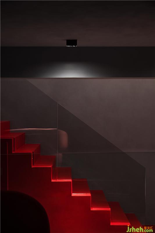 在扁平化的時(shí)代,室內(nèi)空間我們也采用了扁平化的設(shè)計(jì)理念,空間六面體用同一種材料來(lái)闡述,降低空間的立體感。紅色樓梯充當(dāng)空間的垂直流線,同時(shí)成為整個(gè)空間的視覺(jué)焦點(diǎn)。絢麗與清淡并置,激烈彰顯物象張力,在周遭嘈雜中營(yíng)造一方寧?kù)o與熱烈親密相偎的場(chǎng)所。