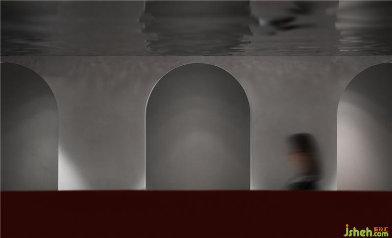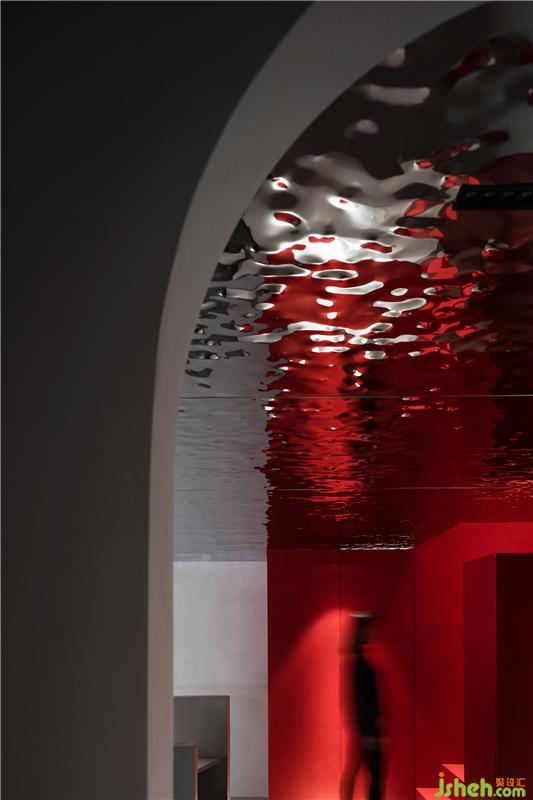 幾何形于弧線的組織,構(gòu)成了空間豐富的表情,于視覺(jué)錯(cuò)像。整體空間用守規(guī)矩的方體進(jìn)行闡述,頂面以及更衣間的弧形門(mén)洞打破了空間的平靜,并且給空間帶來(lái)了女性調(diào)皮的性格。夾層只有2.2米的高度,裝修設(shè)計(jì)空間采用波紋鏡面質(zhì)感,解決空間壓抑的條件,模糊了空間的界限。