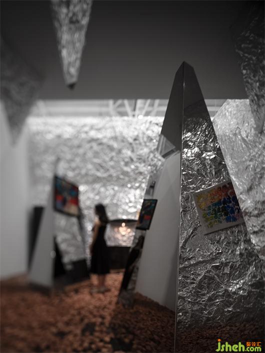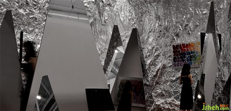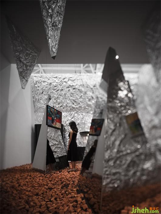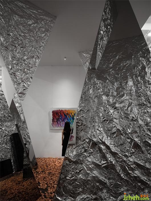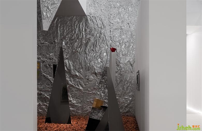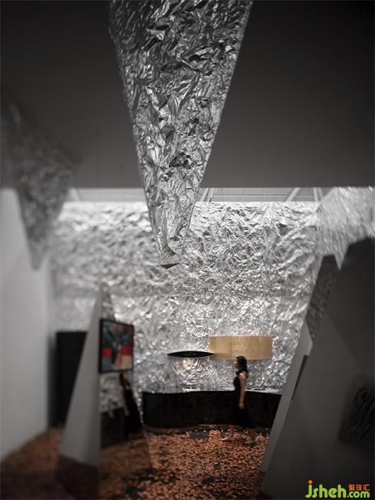 在整體的展覽館中,琳瑯滿目的產品與空間設計,作為觀展者,一天看了無數的產品與展覽館,如何讓流水線中的人產生記憶點,獲得意外。地面的紅色丹霞碎石給人觀展的過程產生危險與意外的信號,這是在視覺以為所獲得的體驗。展覽設計這種體驗是可以直接刺激我們的大腦的。而墻面的褶皺金屬質感,通過視覺的沖擊,吸引人的感觀。特殊定制的玻璃更是讓空間產生豐富的錯解與層次,讓人產生探索的欲望。所有的這一切都在用最強烈的聲音來反饋到人的身體,在體驗上產生意外的驚喜。而最終的目的都是在解決商業(yè)上如何產生高效的流量與記憶。
