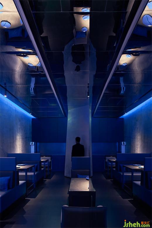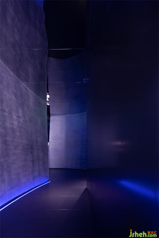 空間察覺有融入爵士和朋克經(jīng)典的藍調(diào),但設(shè)計的表露上并沒有刻意強調(diào)爵士與朋克的元素,藝術(shù)餐廳設(shè)計而是通過畫面的構(gòu)成和內(nèi)在光色節(jié)奏營造出一種冷調(diào)新潮的獨特氣質(zhì)。游離的墻體與迷離的光圈交界。
