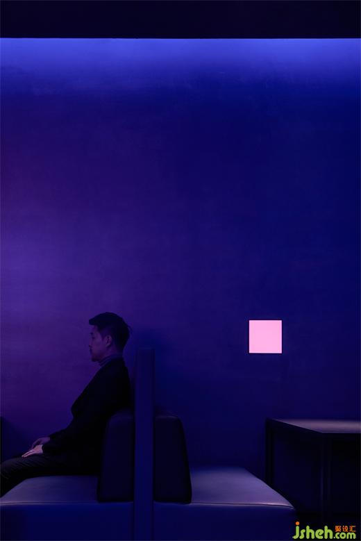 吧臺區(qū)域的情緒,迷幻的光影設(shè)計也更加大膽與大面的鋪陳,其目的是為了將場域情緒的力量擴大化,其爵士與朋克的內(nèi)在精神力量迷幻,熾熱的流動在空間,但又緩慢悠揚且激進的浪漫節(jié)奏。