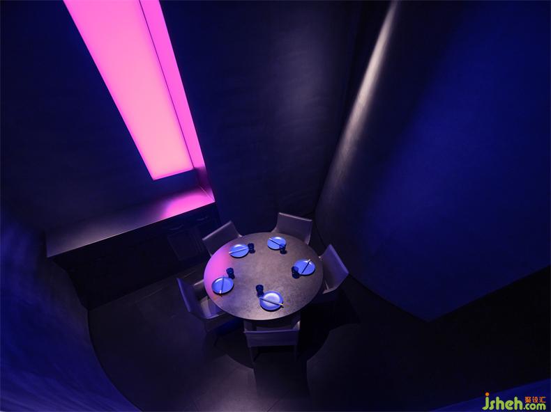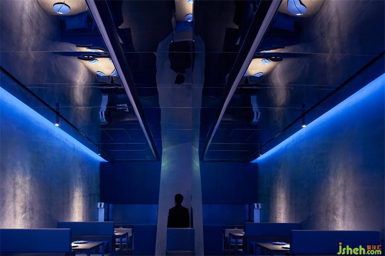 迷幻波長的冷調(diào)藍光隱現(xiàn)在充滿險象的體塊情境中,藝術(shù)餐廳設(shè)計微妙的光影讓空間帶來喘息和微醺曖昧的情愫,對比反差的玫紅色霓虹燈光與餐吧空間高度的鏡像,形成強烈的色彩與光影對比,其魅惑的力量,為觀者創(chuàng)造了一個迷幻體驗情境;最終形態(tài)是一種自由的、魔幻的,激進的藝術(shù)氛圍。