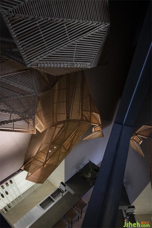 金色的電動門緩緩移動,進入我們視野的是前臺接待與水吧功能結合的多功能服務區(qū),發(fā)光的玻璃酒柜,顯得輕盈又具有高級感。深圳餐廳設計接待臺前方的陣列木盒子,有效的強調了大廳的私密性用餐體驗的同時,產生了強烈的建筑秩序感,吧臺頂部用當代的幾何造型與手工的編制木手藝進行碰撞,圍合出了讓人具有探索欲望的空間情境。