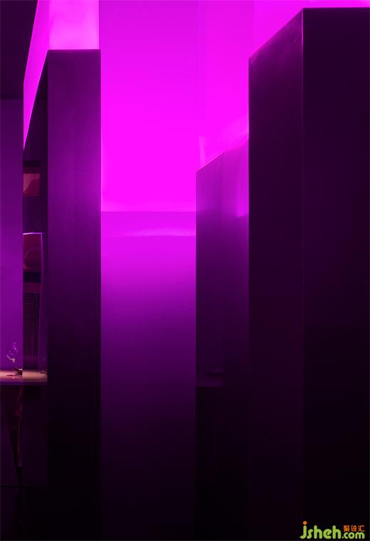 大廳圍合的發(fā)光墻面其意在社交情緒中產(chǎn)生安全的距離感,一方面在給單獨的社交場所以物理形式做出阻隔,另一方面,其物理狀態(tài)下呈現(xiàn)的虛張、力量、與冷調(diào)光影的暈染下,所形成的感知是迷幻的、先鋒的品牌基調(diào)。我們試圖在突破一個穩(wěn)定的結果,以形成新突圍的可能性。
