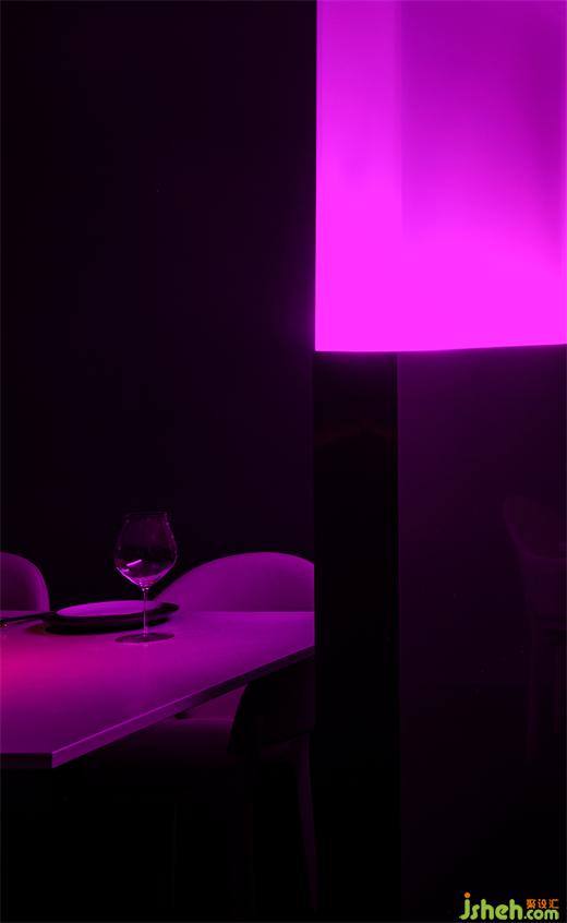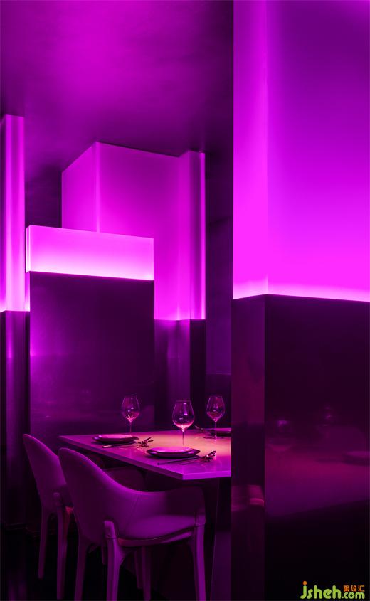 藝術餐廳設計空間通過畫面的構成和內(nèi)在光色節(jié)奏營造出一種冷調(diào)新潮的獨特氣質(zhì)。理性的墻體與迷離的光圈交界,在人的參與下,產(chǎn)生不同故事的場景感,這種事件性是艾克階段性的嘗試,是一種可度量的空間邏輯。