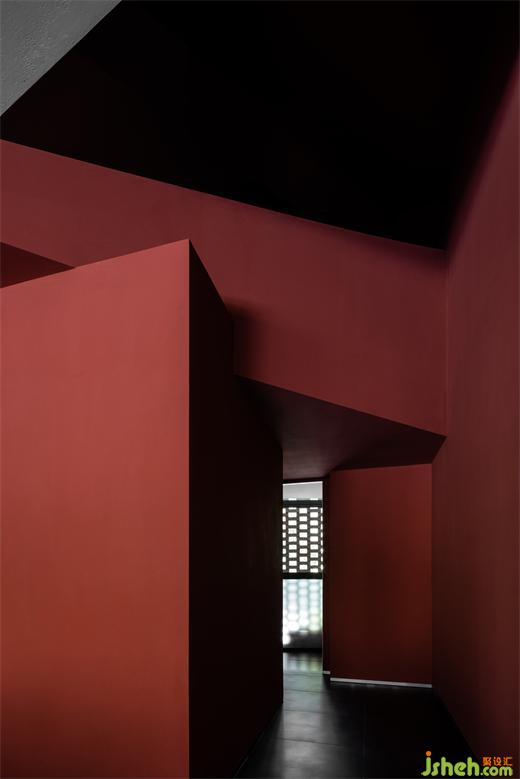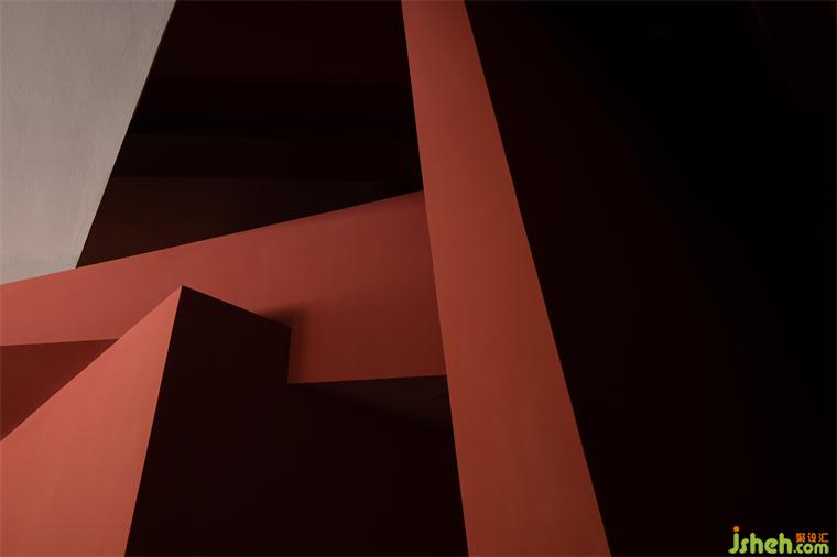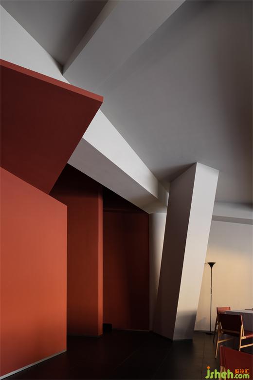 The interior colonnade forms the corridor to create spatial permeability. Except for meeting the dining needs, the space achieves a strong sense of geometric order in the peaceful red palette, and the ceiling light boxes emphasize the deconstruction of space through geometric transformations, creating a tension that integrates geometric structures. The combination of red paint, wood color, and gray bricks symbolizes the collision between modern and traditional elements, and the charming coexistence of the old and new.