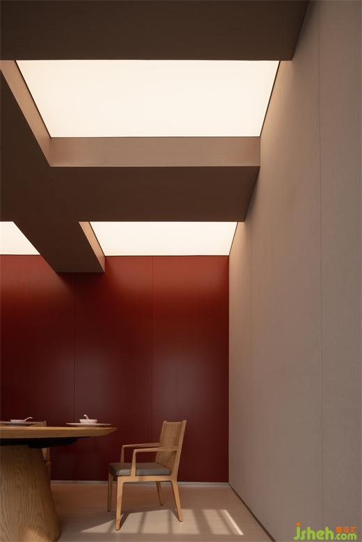 Up to the second floor, what comes into view first is the multifunctional area composed of the reception counter and water bar. The open terrace enjoys a pleasant ambiance. The contemporary geometric form above the bar counter contrast with the handmade rattan furniture and outdoor woven structures, creating a space atmosphere that encourages people to explore through the use of geometric symbols. The bold yet restrained design generates the collision between Eastern and Western aesthetics and philosophy.