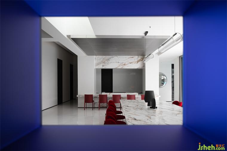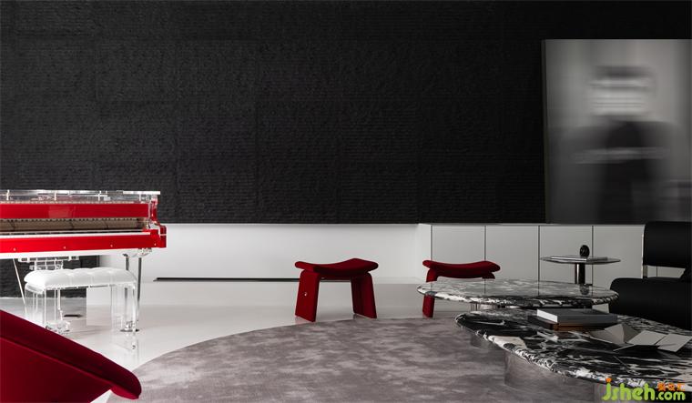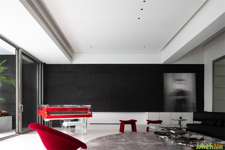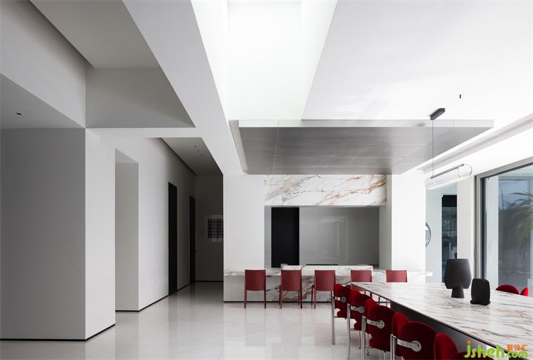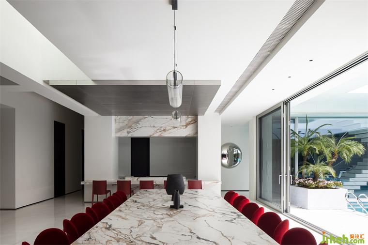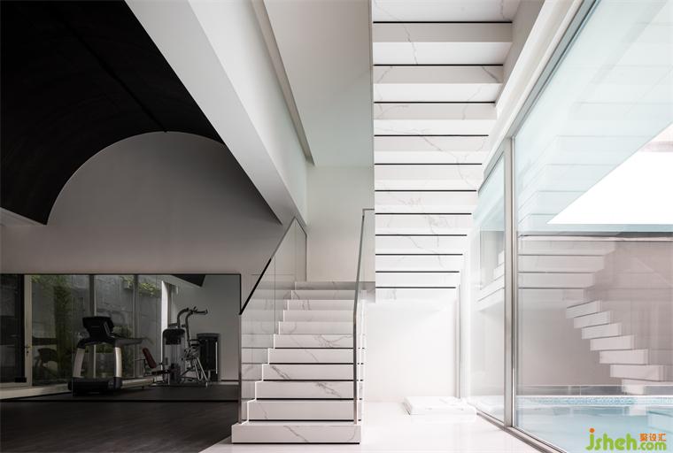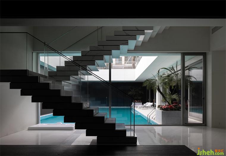 置入泳池,并在其上方創(chuàng)造一個(gè)天井,極簡(jiǎn)豪宅設(shè)計(jì)將外界的陽(yáng)光與空氣吸納至負(fù)一層接待空間。