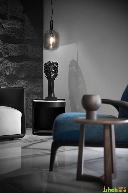 客廳中,沙發(fā)背景采用自然手鑿石片,再掛上一幅樹葉壁畫,原始自然的生活感躍然眼前。藝術(shù)品擺件強(qiáng)調(diào)空間及生活的幽默感,加強(qiáng)了空間流露的情感與藝術(shù)感。靜然佇立的鏤空人像,亦幻亦真,是無聲的物品,也是生活中喜怒哀樂的見證者。