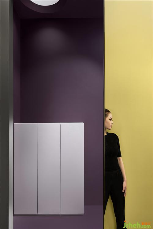 在用色細節(jié)上進行細膩拿捏,以平衡與中和代替了強對比。高飽和的色彩抹上一層灰度,淡然而詩意,讓整面墻的大色塊不致空間絲毫局促或壓抑,反而平添溫暖親和的質感,在燈光的暈染下泛起五彩漣漪。