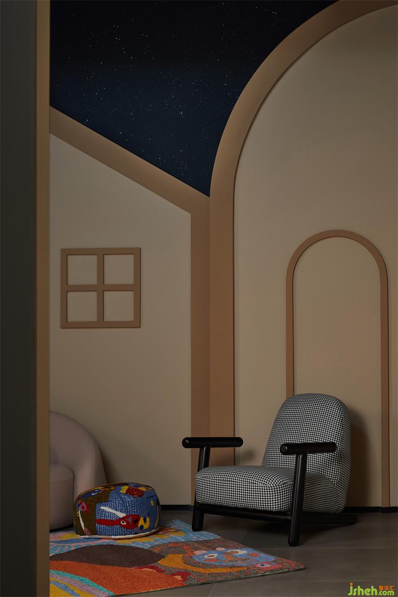 B2 is not as bright as the upper floors,in order to adapt to the dim space,we create an interesting starlight town for children to play in.It’s a great experience to play with parents under the stars.Our aim is letting every family member own their comfort zone in some simplistic shape,while balancing correctly with others.