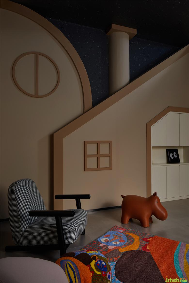 負(fù)二樓不同于樓上的采光,順應(yīng)昏暗的空間,我們?yōu)樾∨笥汛蛟炝艘粋€(gè)趣味盎然的“夜空小鎮(zhèn)”娛樂空間,在天花繁星點(diǎn)點(diǎn)的襯托下與父母嬉戲,其樂融融。花園疊墅設(shè)計(jì)讓每位家庭成員都有自己舒適的區(qū)域,造型去繁化簡(jiǎn),與其它空間取得恰到好處的平衡。