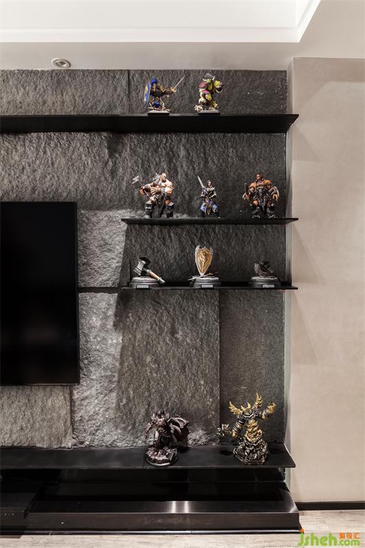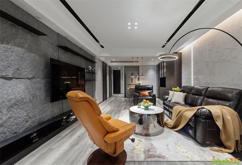 大宅設計以灰色和深棕色為主的現(xiàn)代客廳里,簡約是厚度,硬朗是氣質。兩者結合,成就一個簡單而不平凡的優(yōu)雅空間。電視背景墻采用毛石和線光源點綴使得空間更有立體感。沙發(fā)背景墻采用兩旁功能柜體融入一體設計將整個墻體充分利用起來,起到了很好裝飾作用。