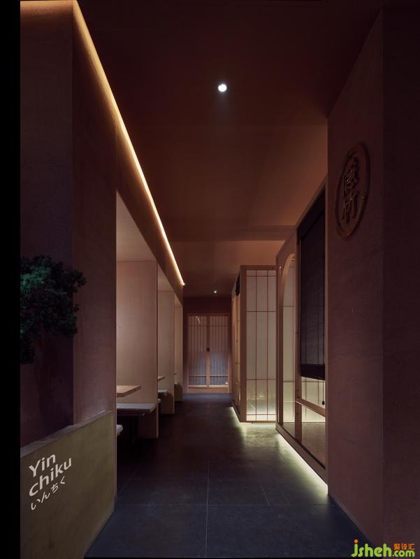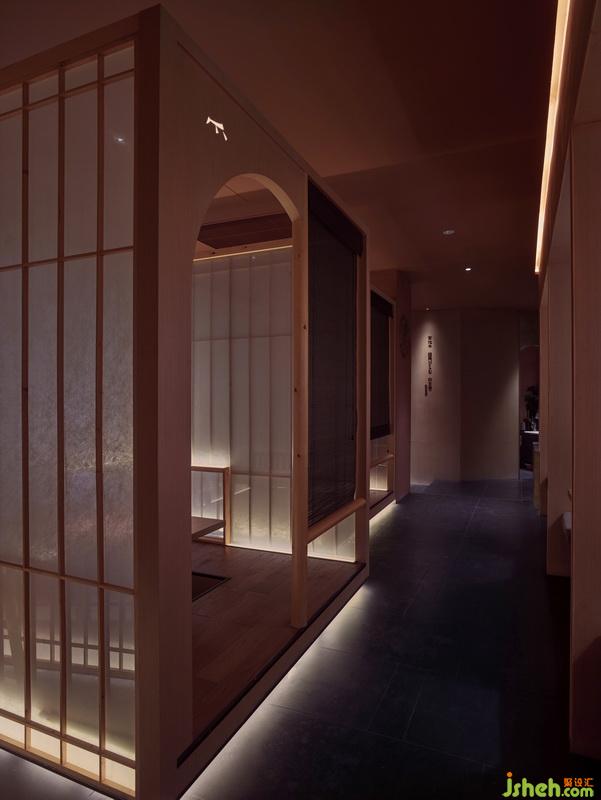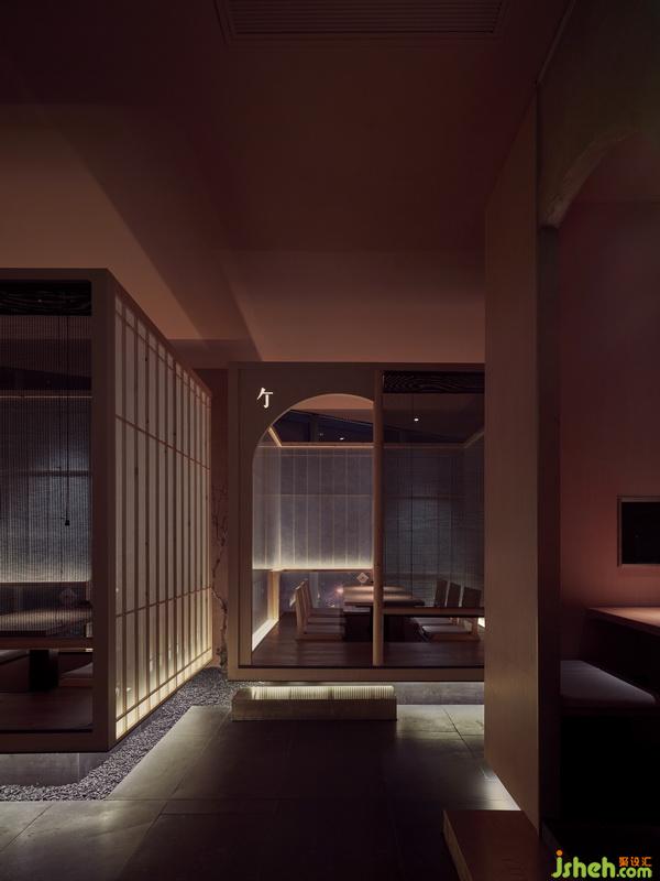 小廂是濃縮的傳統(tǒng)日本數(shù)寄居建筑:平整的離地平臺,由走廊聯(lián)結,踏步,地臺,障子門結構??臻T窗,暖簾,用夾絲玻璃替代宣紙的障子門,營造了三種聯(lián)結外界的對話尺度。有趣的是,對話的比重也有被設計,大面積的夾絲玻璃安全地聯(lián)結店外,半透的暖簾可以看到一個身影,直截的空窗,僅能看見或急或緩的腳步。室內(nèi)設計師在純粹的就餐空間中,坐姿正襟的食客也能找到富余變化的視覺樂趣,有所選擇,將視線停留在樂意處。每個廂相互獨立,避免平臺共振的打擾。障子門間、地臺間的空隙,成為氣流的良好通道,保證餐廳的空氣內(nèi)部循環(huán),新風系統(tǒng)帶來的新鮮空氣由頂部入,濁氣沿著底部通道排出。常見于“枯山水”中的沙石造景,更增加了餐廳場景的庭院感,有了延伸至日式庭院的想象空間。