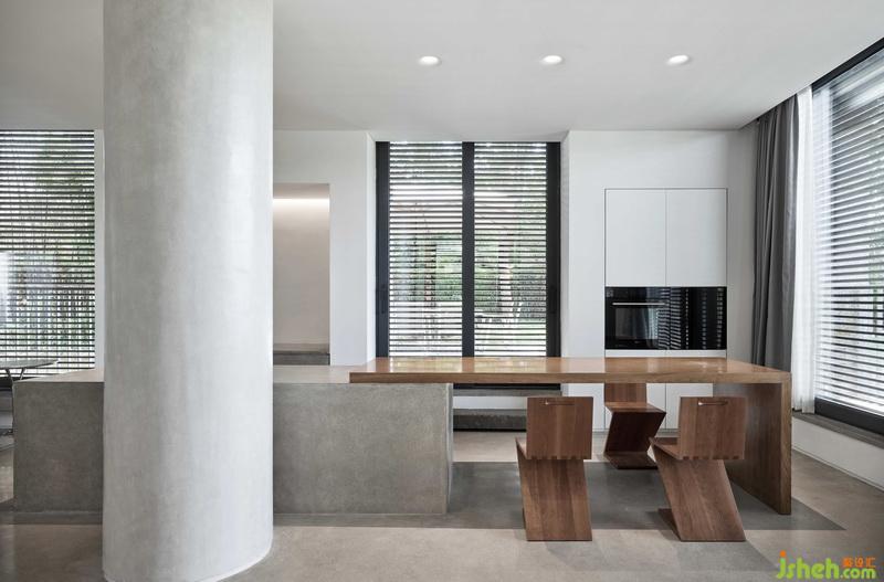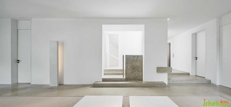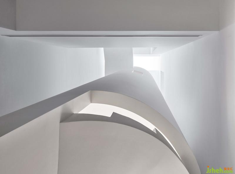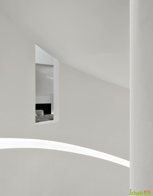 悅莊的一二層公共空間的主體材質(zhì),除了極少量的木材,幾乎只用了乳膠漆和清水混凝土。空間的幾何關(guān)系,除了規(guī)整的直線,幾乎只用了圓弧。這樣極簡的空間,是我們對建筑大師大衛(wèi)·奇普菲爾德的回應(yīng)。