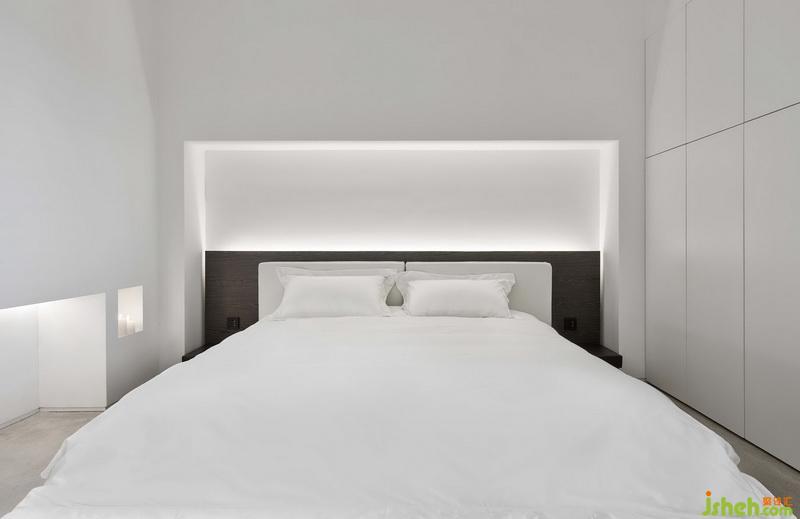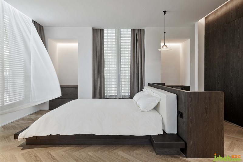 我們將床作為主臥的核心,安置在房間中央。為了增加安全感和柔軟感,地面和背后的墻體運用了漸深的木材。窗簾薄紗清淺,飄逸中帶入光線,呼應(yīng)墻體左右燈影。