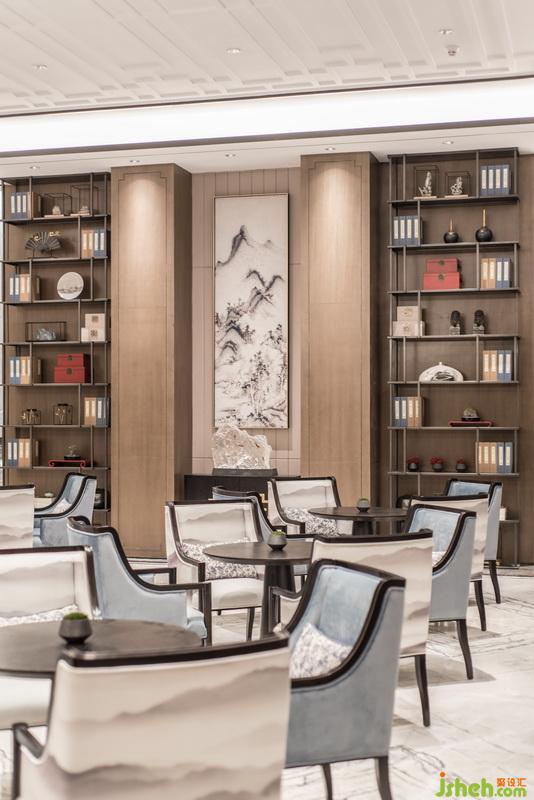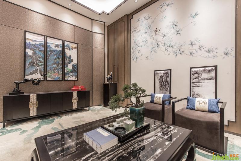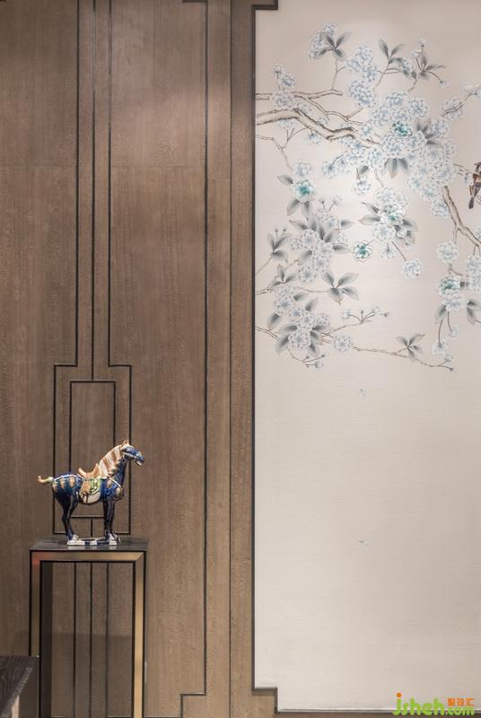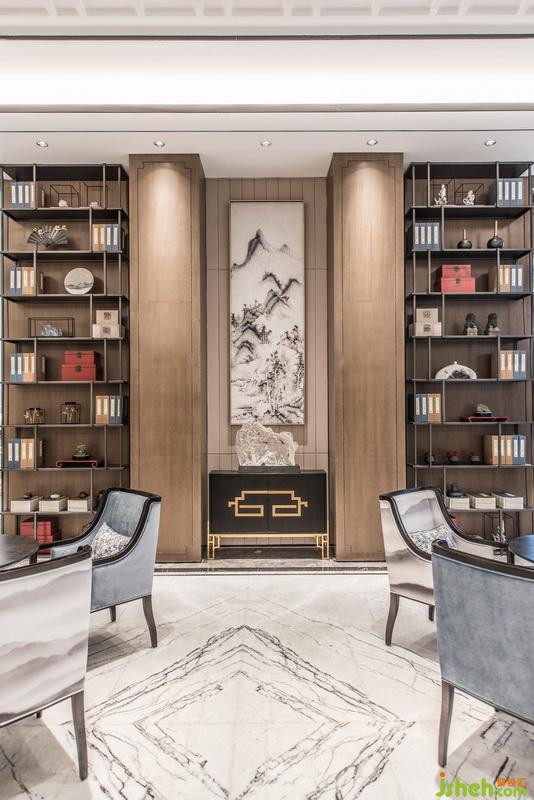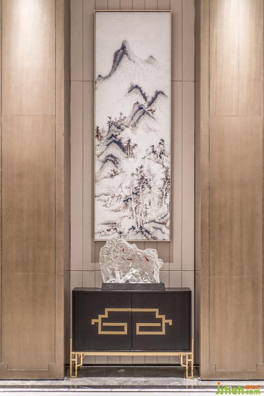 移步移景,在書柜中間的玄關(guān)上巨幅名家水墨山水畫用現(xiàn)代的裝置手法來展現(xiàn)。具有琥珀般效果的精美山形晶石擺件的運用,則希望能把時間這個概念在這個空間中定格下來,形成豐富的空間層次感及現(xiàn)代感。