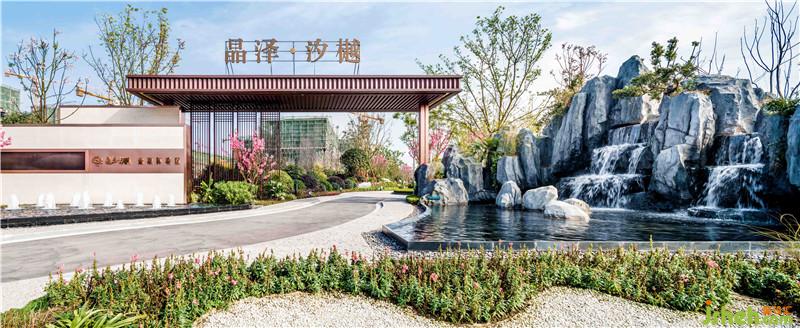 進(jìn)入晶澤·汐樾,具有歷史地域文化識別性的特征開始映入眼簾,中式的山水風(fēng)景,園林花卉,石山流水,畫面怡人。