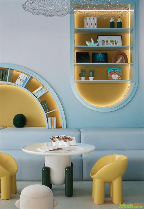 室內(nèi)設(shè)計整個兒童區(qū)墻面大面積漸變藍色,打造出空靈、浪漫且具有童趣的空間氛圍,猶如蔚藍的天空之境。而在淺色調(diào)中融入淡淡的關(guān)懷,圓弧線條柔和的明黃色小凳和米白色桌子展現(xiàn)出家具的安全性和活潑性,有一種安適、自然、輕快的感覺。