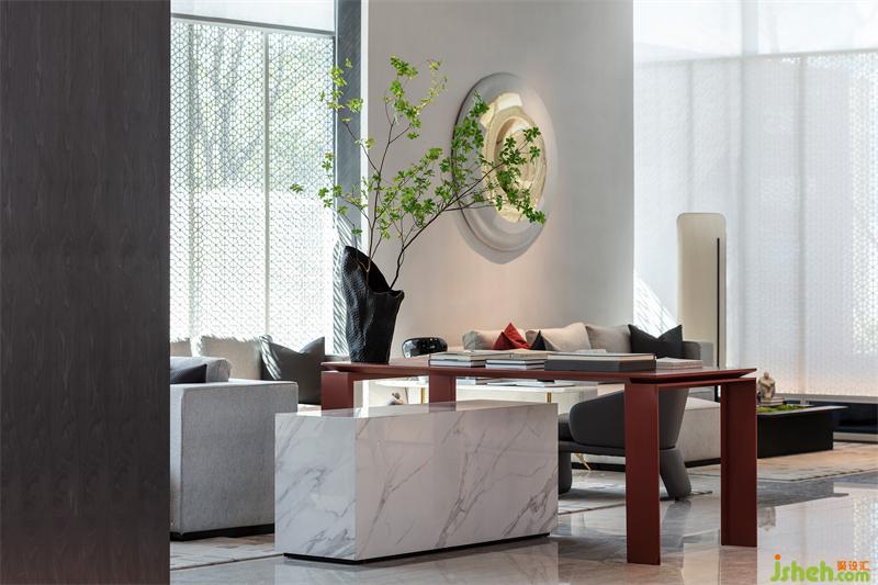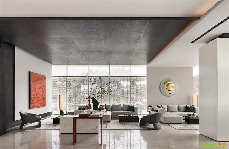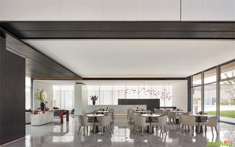 園林的湖水化作一簾紅雨,售樓處設計傳統(tǒng)與現(xiàn)代靜默交織,為素雅的空間增添靈動之感,讓人在自然行進之中,感悟藝術(shù)心境。