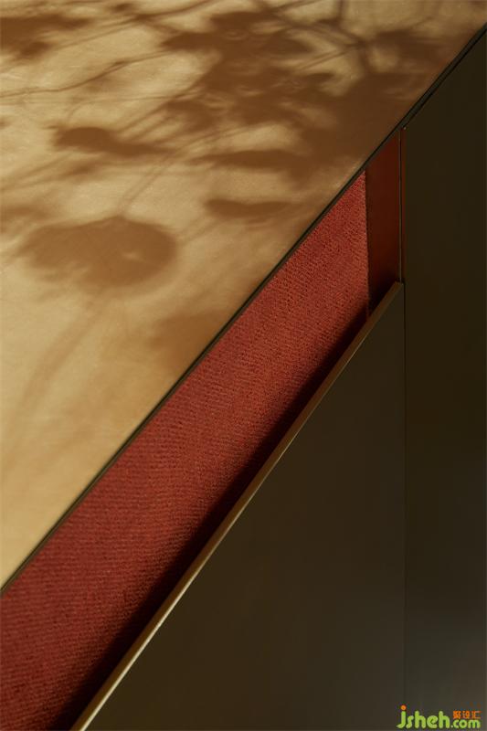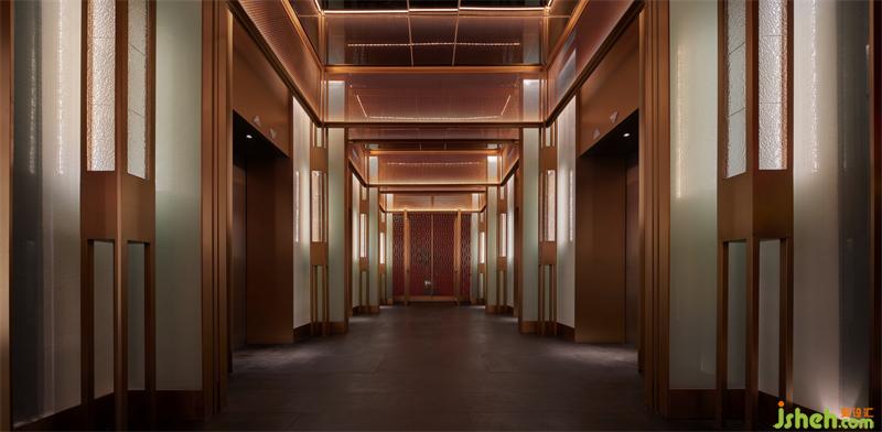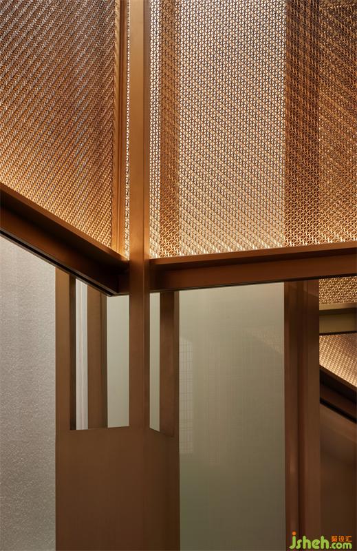 入電梯廳,白青色的夾絲玻璃呈現(xiàn)玉面的質(zhì)感,來(lái)自空間兩端的紅色肌理墻,透過(guò)漫反射暈染著電梯廳的每一處角落。四根金色立柱從地面延伸至鏡面的天花,與金屬網(wǎng)框交織,無(wú)限延展,循環(huán)往復(fù),無(wú)盡空間。
