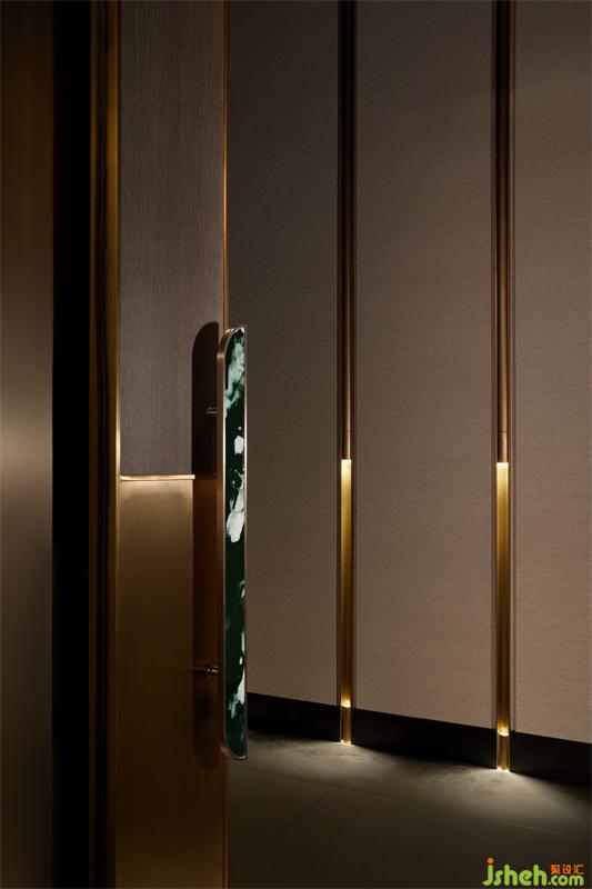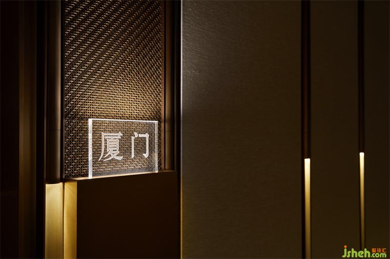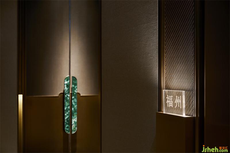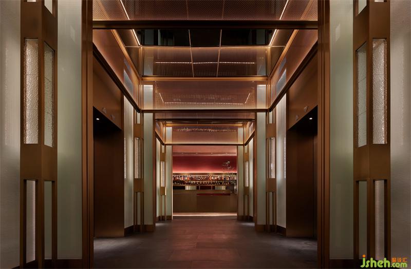 餐廳設(shè)計(jì)立柱的腰端鑲有薄冰似的光柱,光與影的交互形成斑駁。電梯廳共分為三段,由完全相同的小廳組成,隨著行進(jìn)的方向,三組音符落下,開啟我們的尋味之旅。