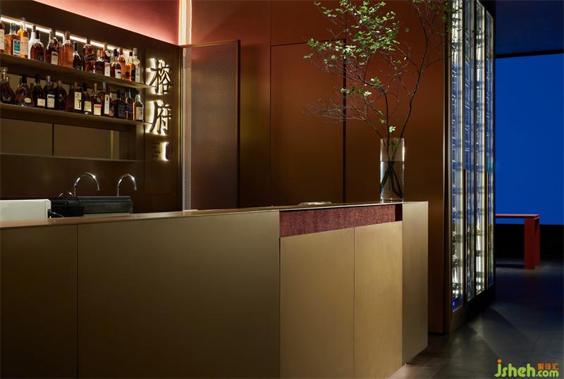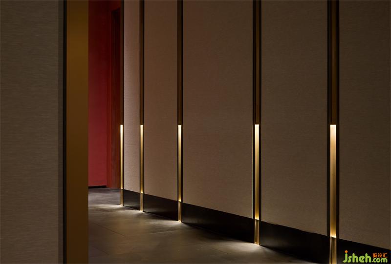 局部展露的服務(wù)臺(tái)暗示了下一個(gè)空間,形體由金屬塑造包裹的墻壁,完成“形”與“間”虛實(shí)轉(zhuǎn)換,自然過(guò)渡。從接待廳行進(jìn)至包廂走廊,依然由三個(gè)空間組成,循序漸進(jìn),空間尺度依次遞減,照度逐步降低,旋律漸漸平緩,遠(yuǎn)離喧囂,回歸寧?kù)o。